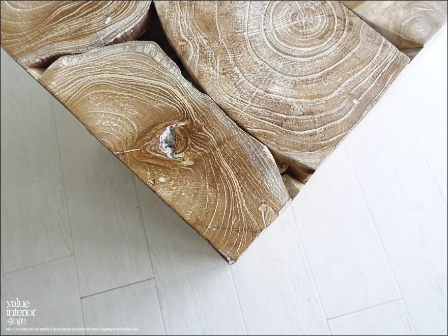 チークをブロックのような形に組み合わせたデザインでインテリアとしても配置しやすく、椅子だけでなく花台として使っても素敵です。ホワイトの塗装を施してから磨き削ることで、木目に程よくホワイトが入り込む独特な風合い。表面加工にもとても手間を掛けたお品です。幅広いインテリアにも馴染み、ペースダウンした雰囲気も存分にお楽しみいただけますよ。ぜひこの機会にどうぞ。