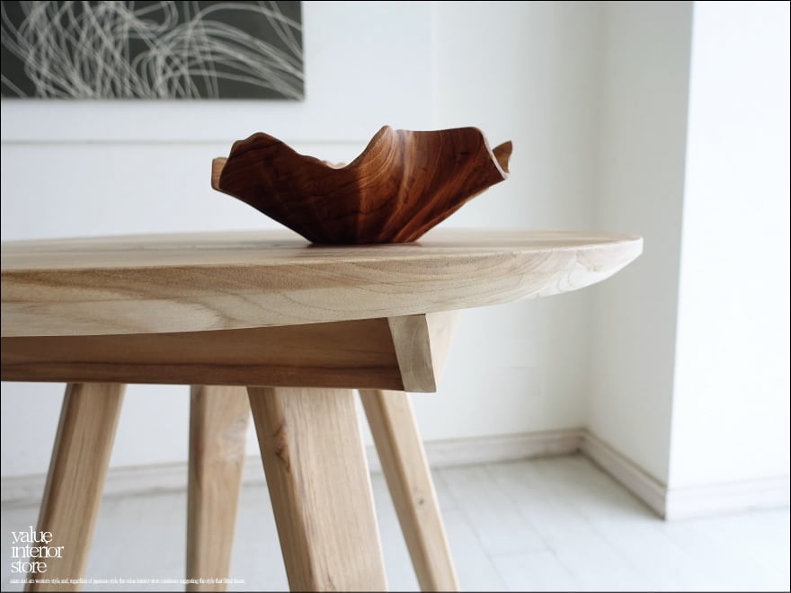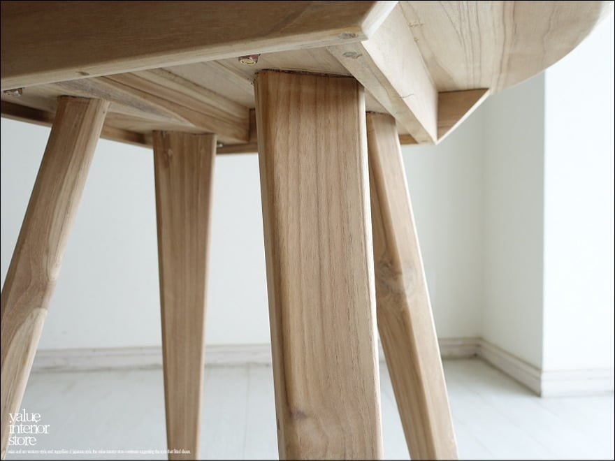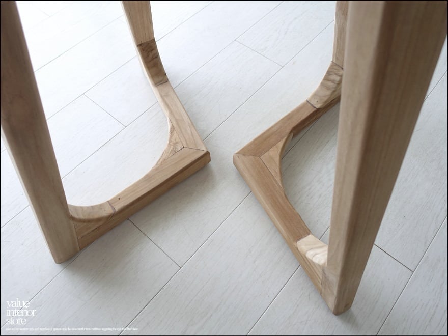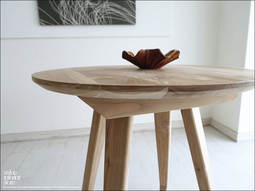 天板をバランスよく安定させるために、内側に入った脚の形状が印象的なチーク無垢材の“カフェテーブルbulat“。厚みのある天板下を削ることでよりシャープでシンプルなデザインになっています。細かく入った木目が品質の良さを感じさせてくれ、無垢材のそのままの明るい質感で柔らかな空間に包み込んでくれます。一息ついていただくコーヒーテーブルとしてお勧めいたします。