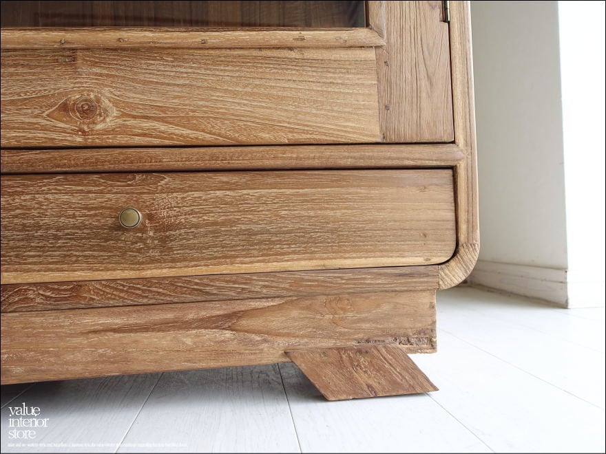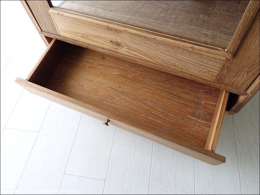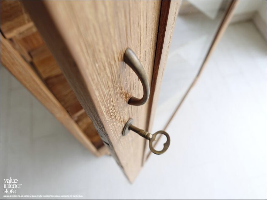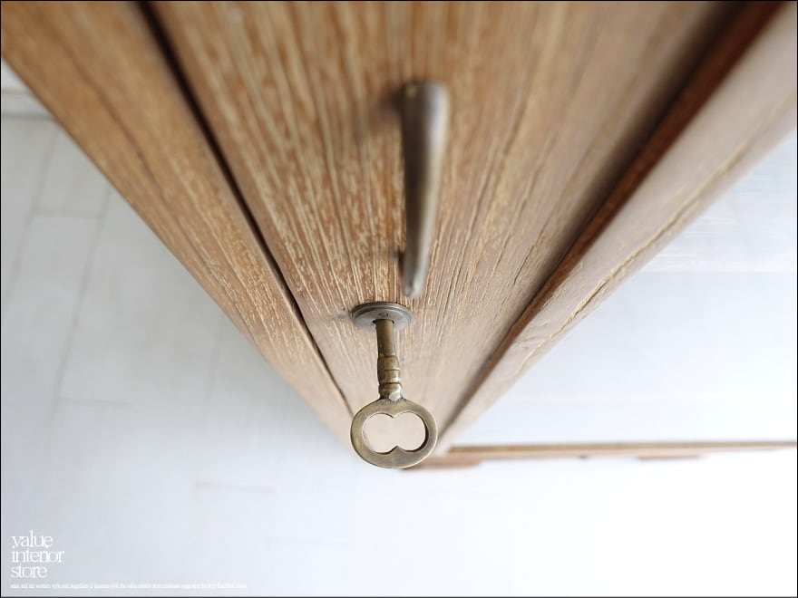 存在感のある大きさで奥行きもたっぷりあるのでキッチンの食器棚としてもリビングの収納棚としても便利にお使いいただけます。扉はガラスなのでディスプレイするような感覚で中に入れるものにもこだわりたくなります。扉は真鍮鍵付き。鍵がとても可愛らしく、きちんと機能しています。全体的に素朴で落ち着いた色合いでシックな雰囲気を残した表面処理(ワイヤーブラシで表面を削るラスティック仕上げ)になっています。カフェやショップなどの什器として食器棚、本棚、収納棚などにもおすすめです。