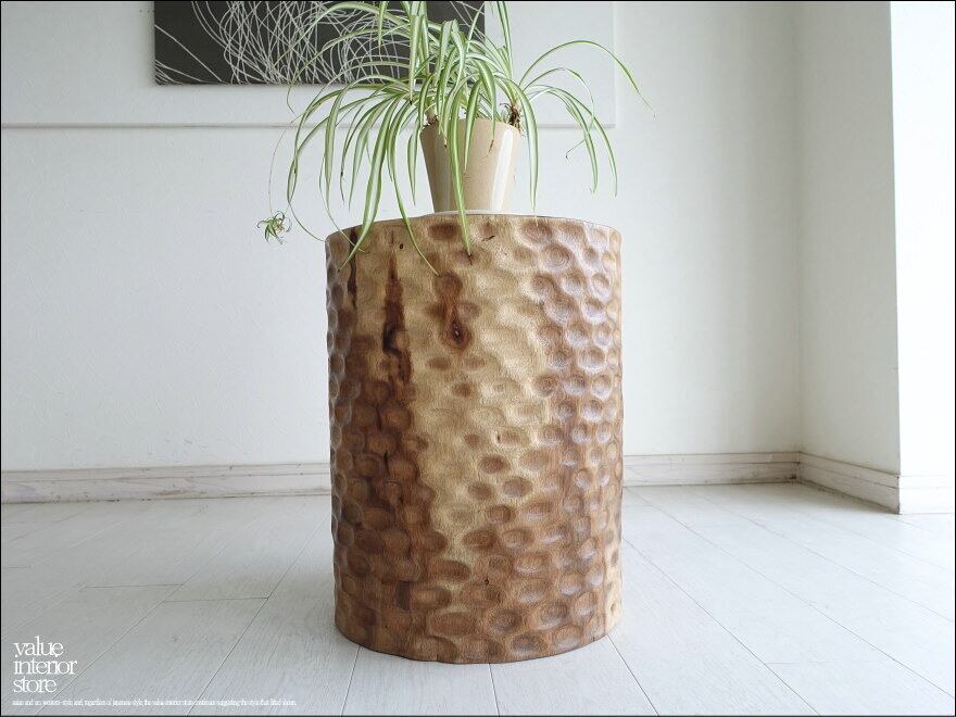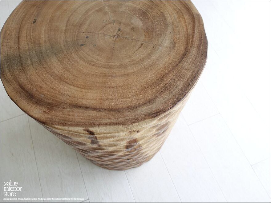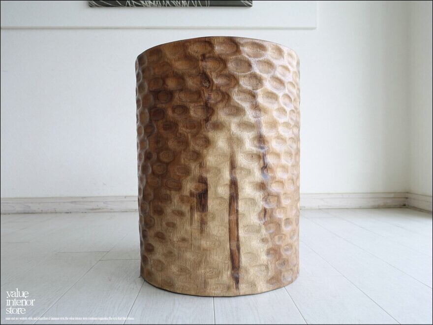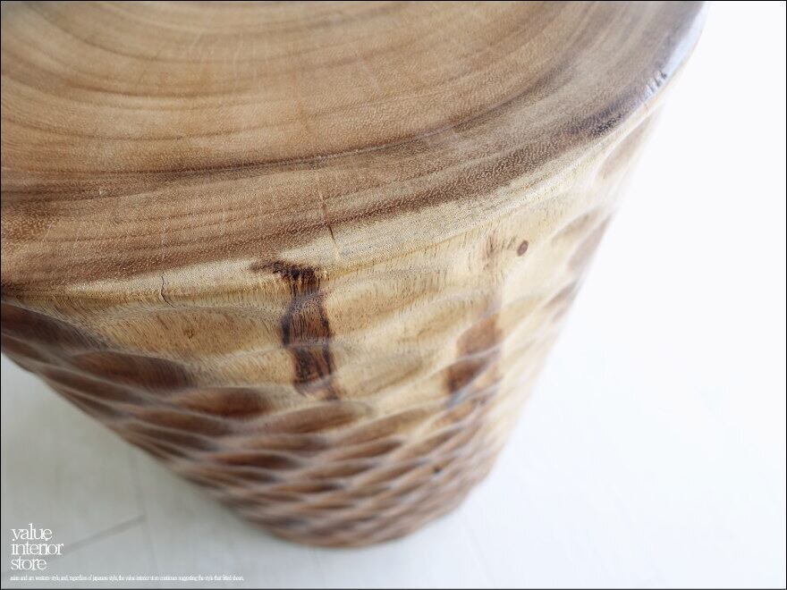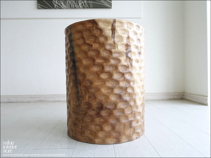 モンキーポッド総無垢材の木肌が優しい印象のスツール。丸太より削り出して製作していますのでどっしりとした重さがあります。側面は“ちょうなはつり“を思わせるような彫り物がユニークで、スツール以外にも花台やディスプレイ台としてもお勧めいたします。お気に入りの空間でお使い下さい。