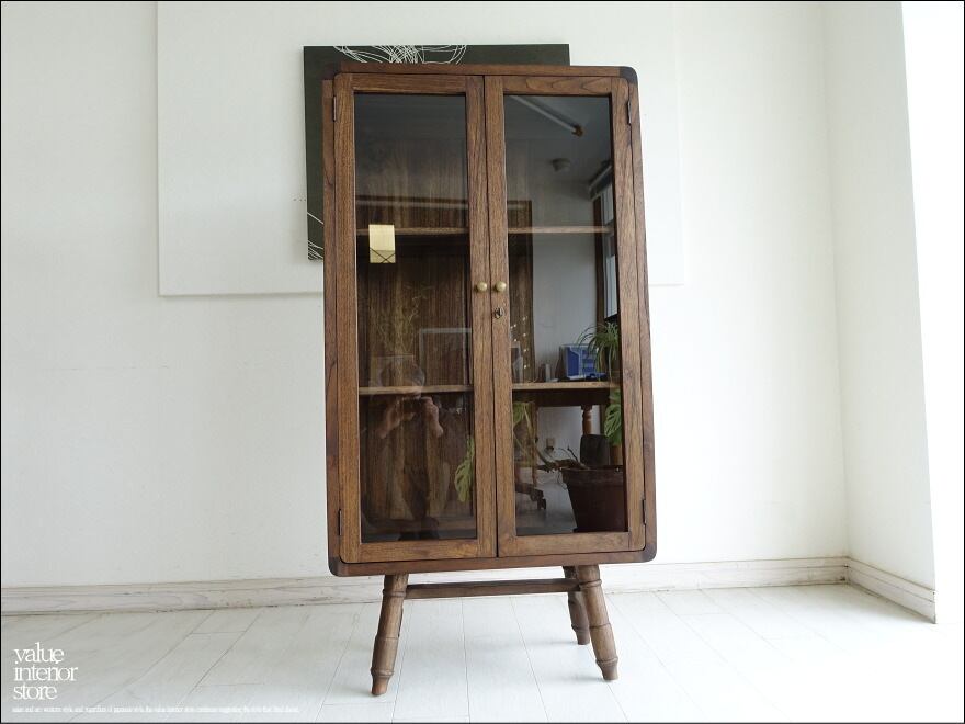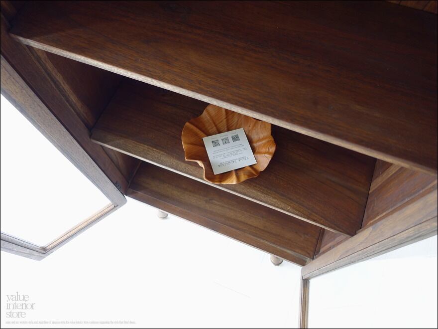 フレームはチーク総無垢でガラス面が多く中がキレイに見えますので、お店のショーケースとしてもお使いいただけます。無垢材の素朴な質感は古くからそこにあったような温か味のある仕上がりになっています。カフェなどのパン用ショーケース、食器棚、小物のディスプレイなど幅広くお使いください。