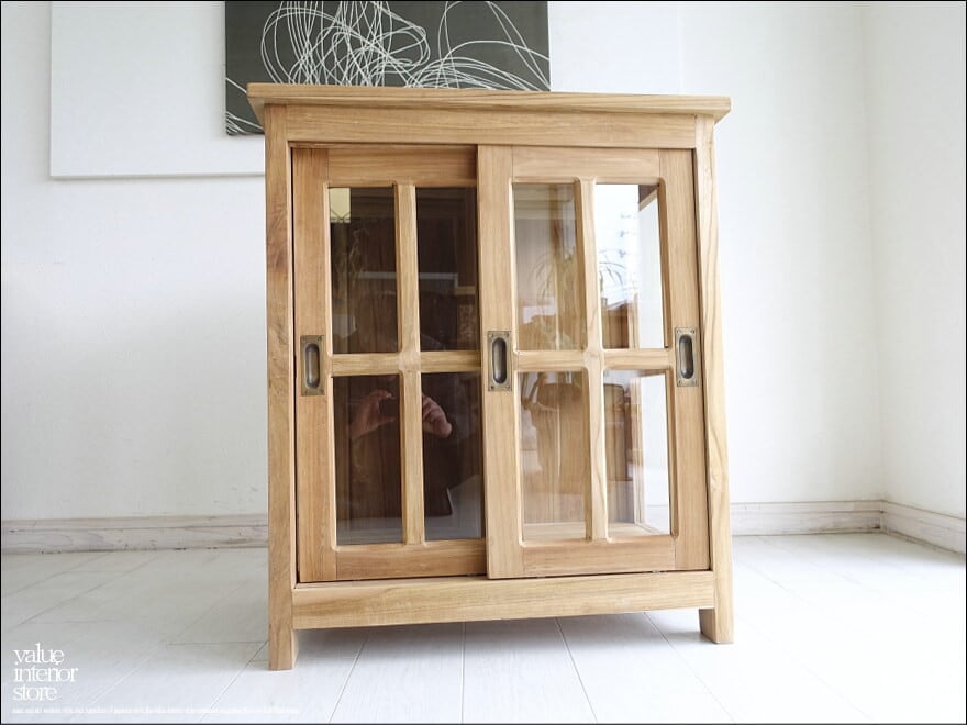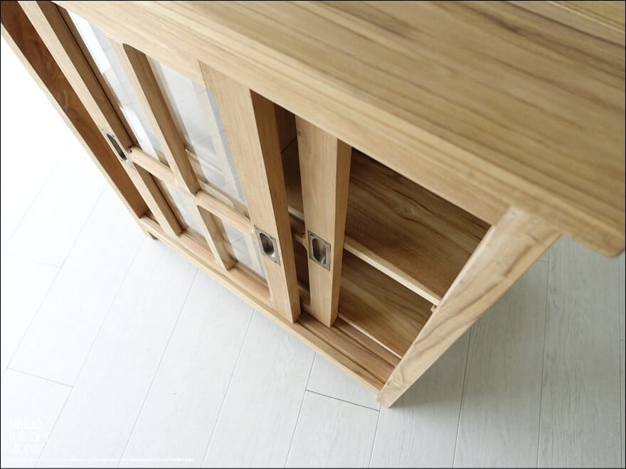 チーク総無垢材で贅沢に仕上げた使い勝手の良いスライド扉ガラスキャビネット。