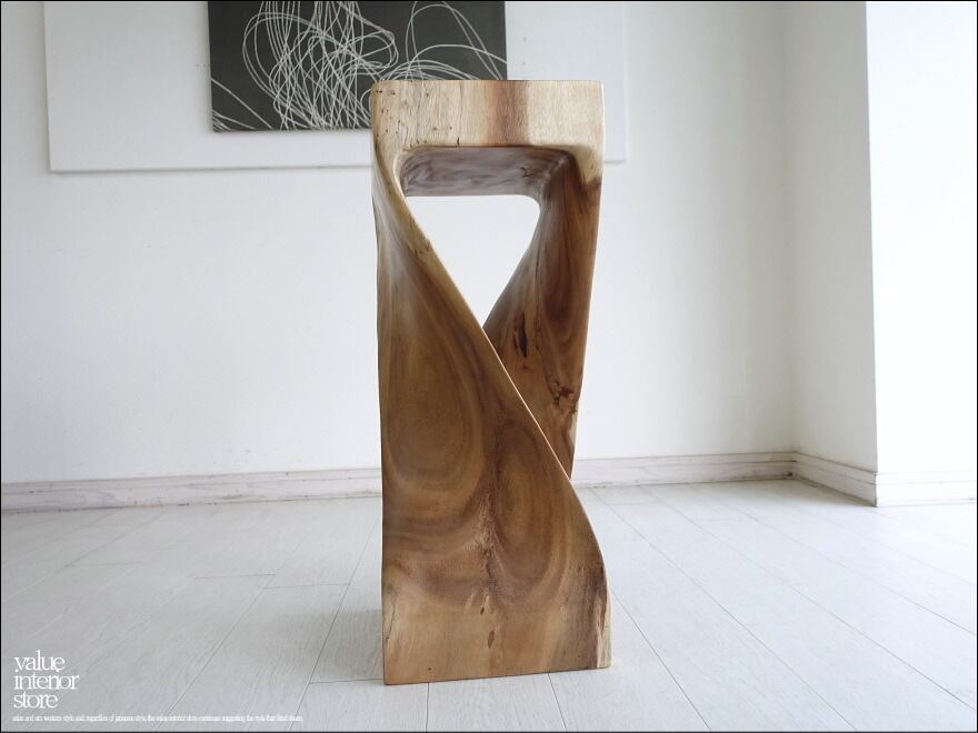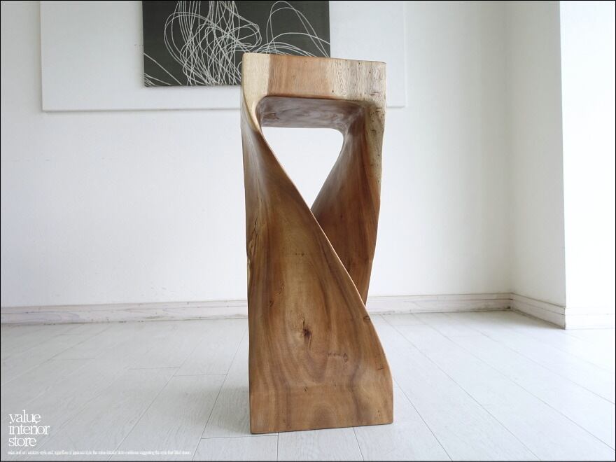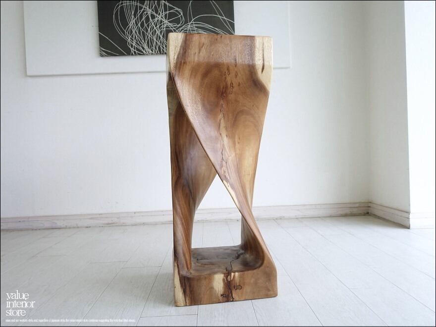緩やかな螺旋の曲線が優しい印象のモンキーポッド総無垢材のバースツール。ナチュラルな雰囲気で幅広いテイストに合わせやすく設置しやすいスツール。スツール以外にも花台やディスプレイ台としてもお勧めです。お気に入りの空間でぜひお使い下さい。