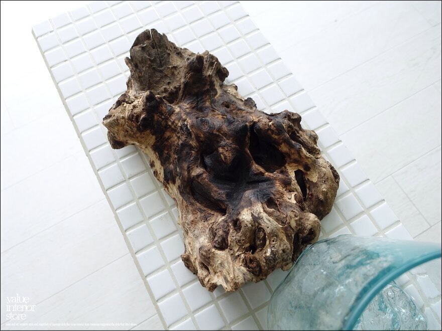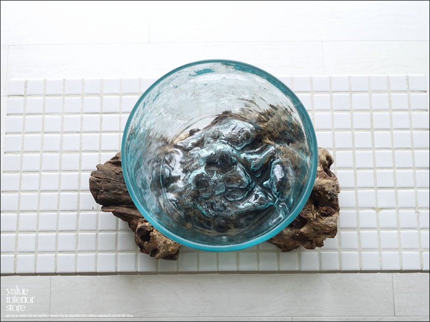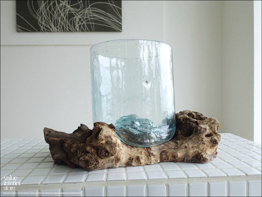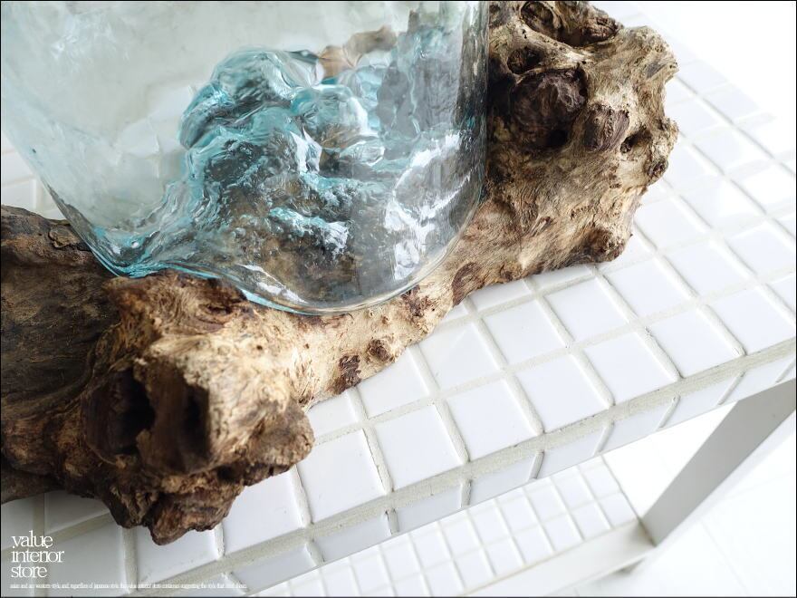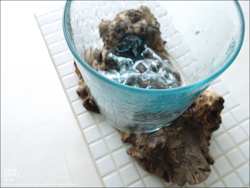 プリミティブな無垢材の土台に吹きガラスを合わせたフラワーベース。メダカ鉢にも良いサイズです。同じ形のものはなく、どちらの素材も大変個性的で味があります。