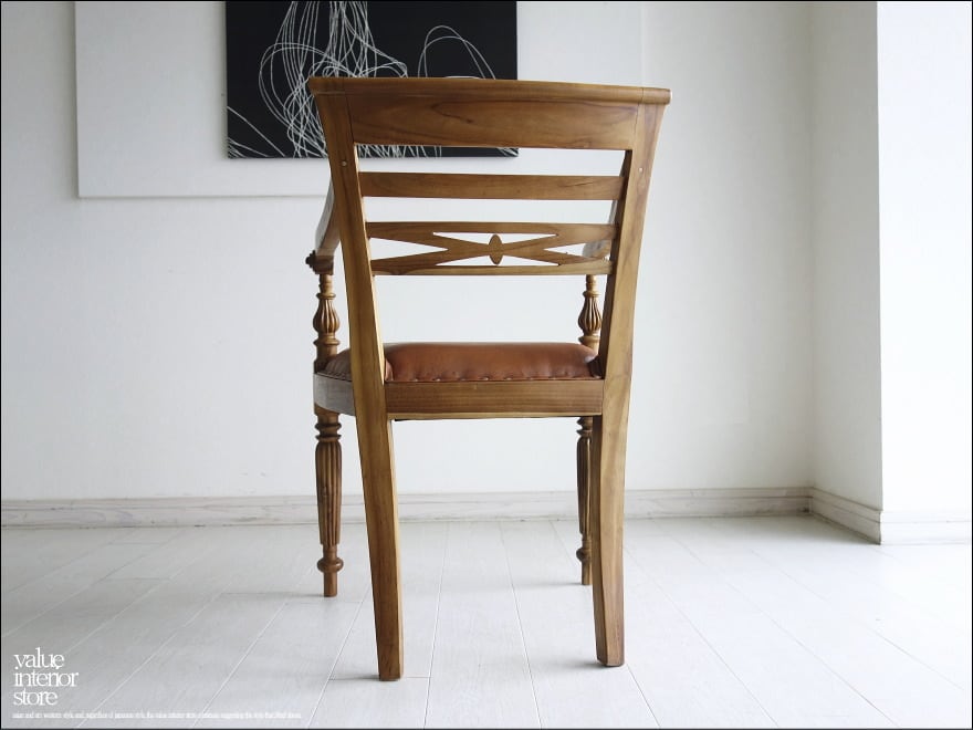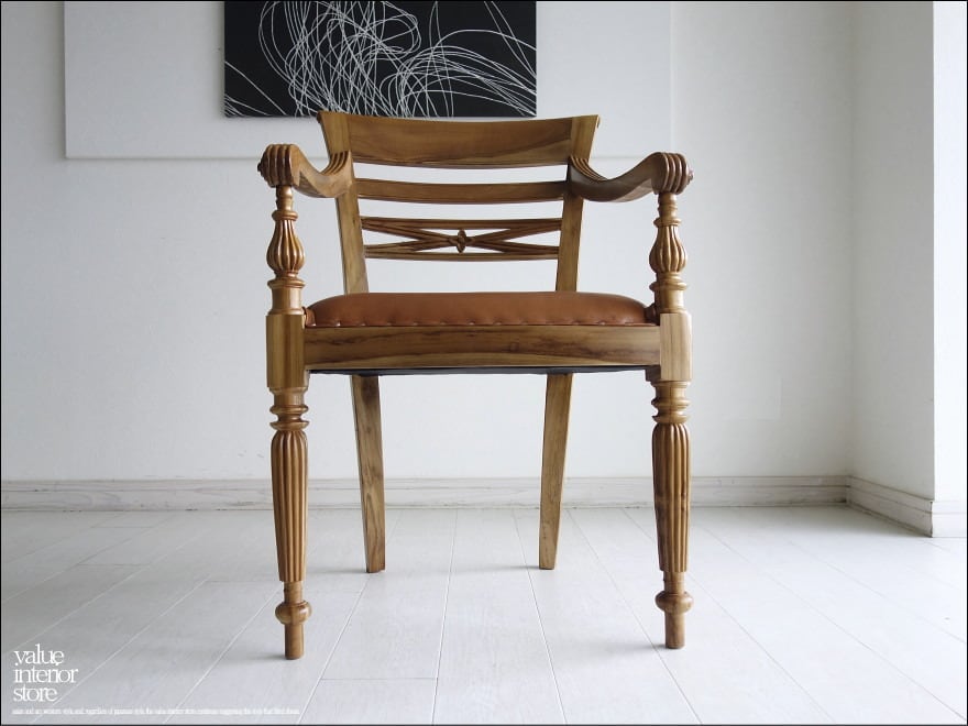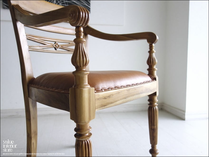 背もたれ、アーム、脚に至るまで細かな彫り細工が施され職人さんが丹精こめて作った印象に溢れています。フレームのチーク材はナチュラルで、渋く変わり行くチーク独特の色の変化(いわゆる徐々にチークカラーへの変化)をお楽しみいただけます。堂々とした落ち着いた佇まいでアンティークな家具やアジアン家具とよくマッチします。スローダウンした素敵な気分を味わえますのでぜひお気に入り空間でお使い下さい。