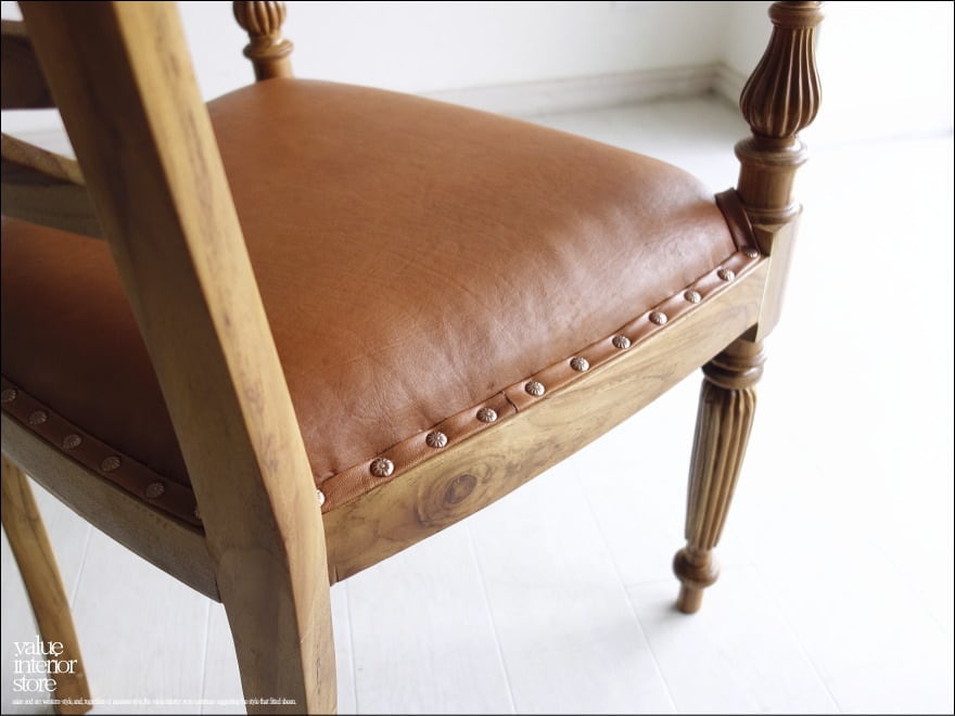 ・チークの味のある風合いが魅力のウッドフレームに、高級感のあるレザーを座面を独特なスタッズで打ち、置いてあるだけでも存在感のあるチェアー。