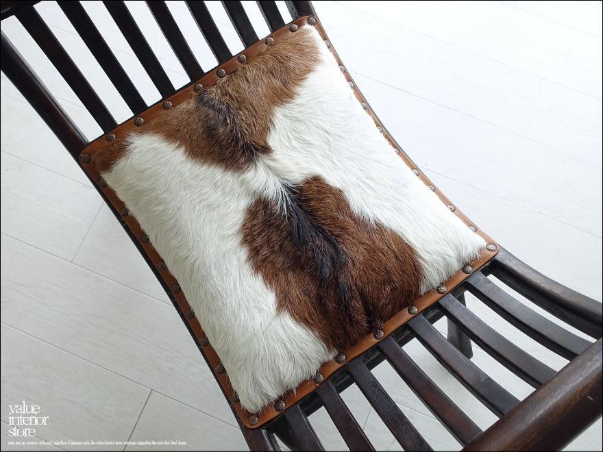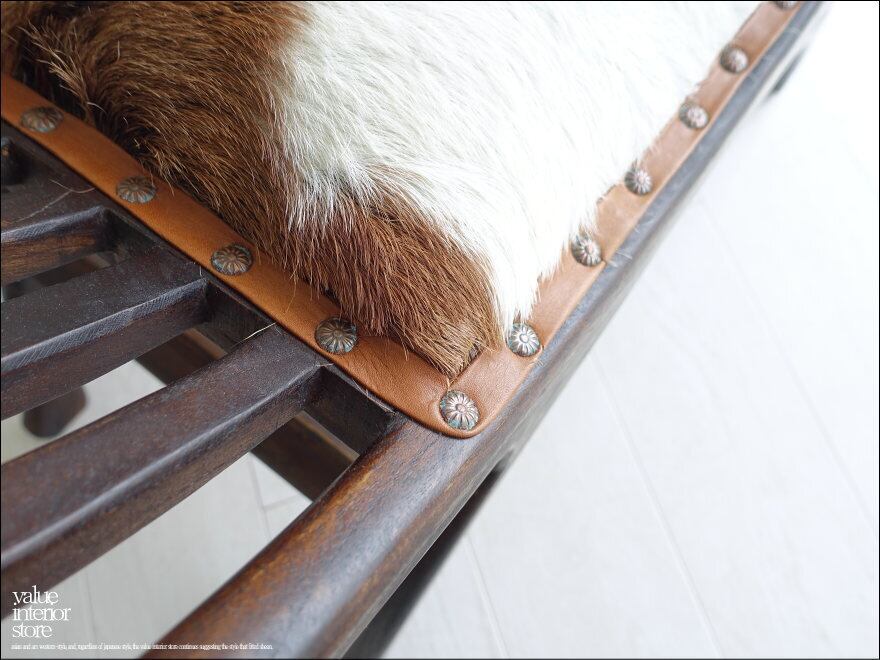 チーク無垢のウッドフレームに毛皮付きレザーの座面を組み合わせたスツール。フレームはダークブラウン塗装の渋い色合いで、独特で伝統的なフォルムは置いてあるだけで存在感があります。