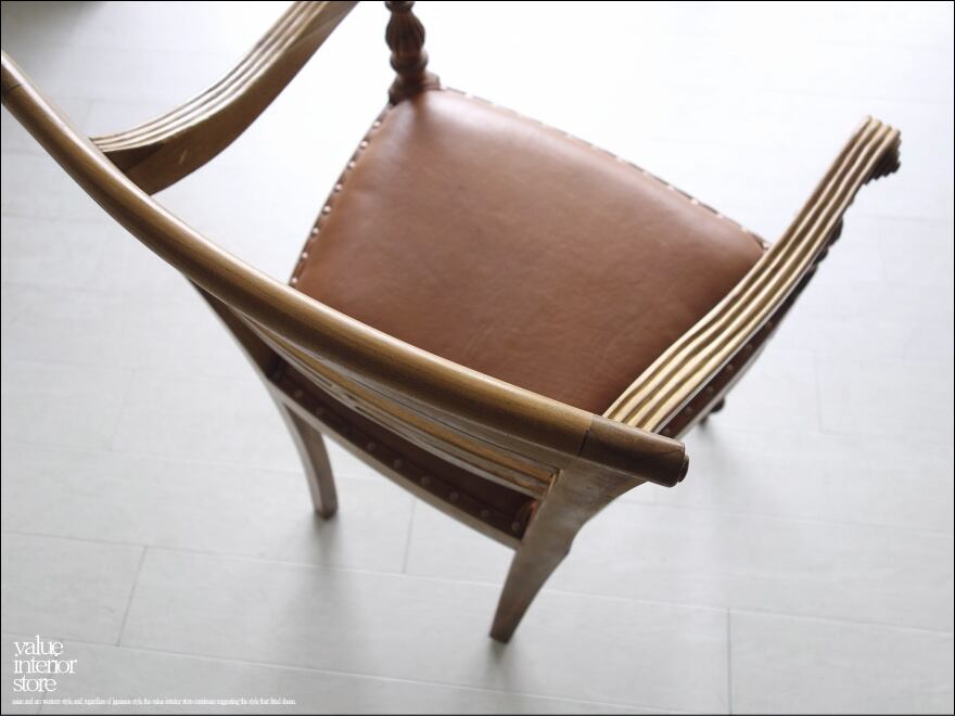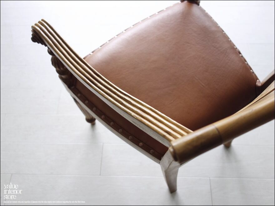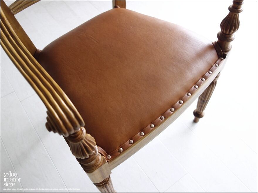 ・チークの味のある風合いが魅力のウッドフレームに、高級感のあるレザーを座面を独特なスタッズで打ち、置いてあるだけでも存在感のあるチェアー。