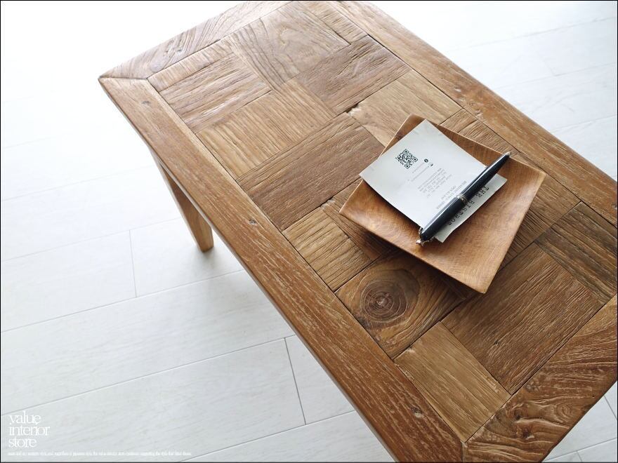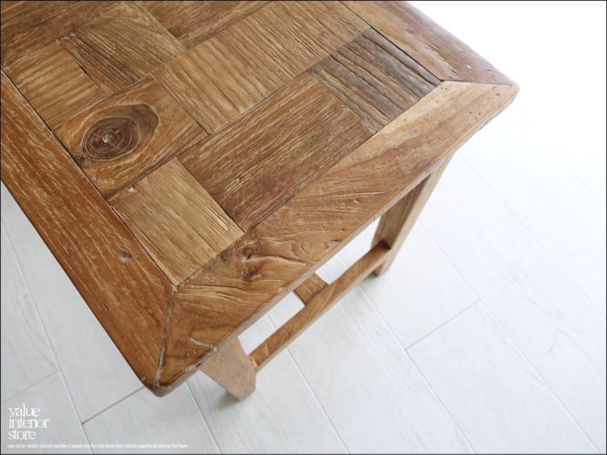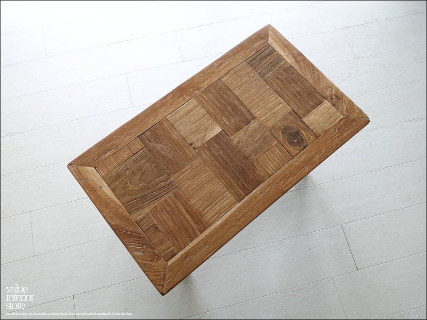 オールドチークならではの味のある雰囲気が魅力のスツール。タイル状に端材を組み合わせたデザインが素敵です。チークならではの荒々しさと、古材ならではの変化に富んだ木肌が全体的に見られ味わい深く仕上がっており、きっとお部屋をスローダウンした素敵な雰囲気に包んでくれます。ベンチだけでなくインテリアのディスプレイ台としてもステキです。