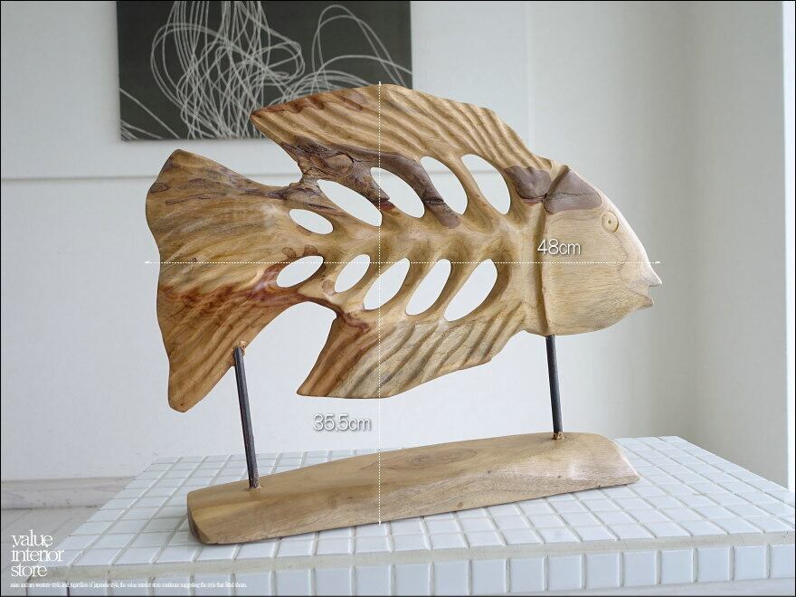 チーク無垢材 置物/魚 装飾 魚の形のオブジェ カフェ装飾 飾り フィッシュ デコレーション fish 無垢材アート 什器 置き物 W48xH35.5cm