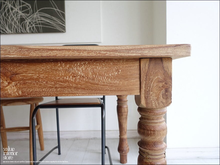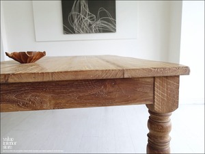 フシや凹凸などの変化に富んだ素材の味わい深さが感じられる、オールドチーク総無垢材のダイニングテーブル。天板を支えるフレーム部分にもしっかりと厚みがあり重厚感があります。昔から使っていたような古材家具ならではの落ち着いた大人の雰囲気に仕上がりました。チークの渋く硬い特徴を引き出す角型の天板を柔らかな丸脚が支えていて、そのバランスも上品です。ショップやカフェのテーブルとしてもおすすめです。