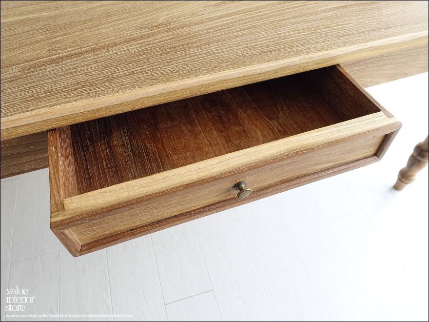 チーク材独特の色合いで、オールドチークならではの渋く落ち着いた質感から雰囲気が感じられます。表面はワイヤーブラシで軽く削り取ってからサイディングした仕上げで、チーク材の張りと硬い質感が伝わってきます。職人さんが丹精こめて作った印象に溢れていて、このデスクに向かうと自然と気持ちまで落ち着くようです。西洋、アジアン、和風モダン、北欧など幅広いテイストのインテリアと相性良くコーディネートできますのでお気に入りスペースでお使いください。
