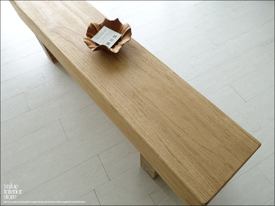 細かく変化に富んだ木肌を存分に感じていただける、チーク総無垢材の角型ロングベンチ。表面仕上げにあまり手を加えず、オールドチークチークならではの色味と質感をそのまま生かしていますので、重厚で堂々とした印象を受けます。通常何台分ものベンチの座面に相当する素材を丸ごと一本使用しており、重さも実に102kgとズッシリとしています。