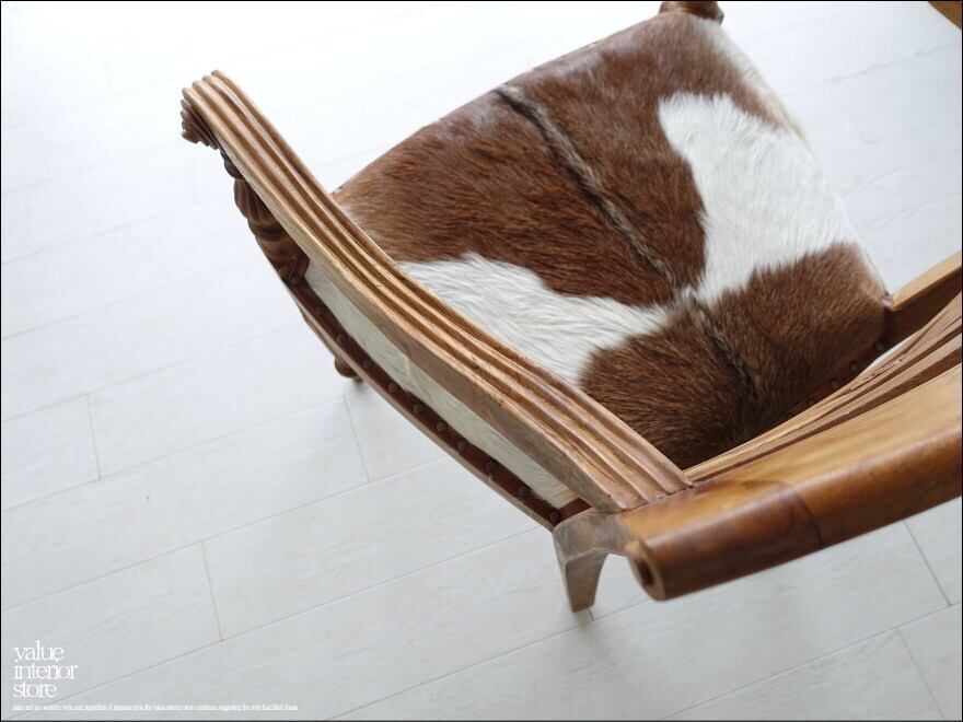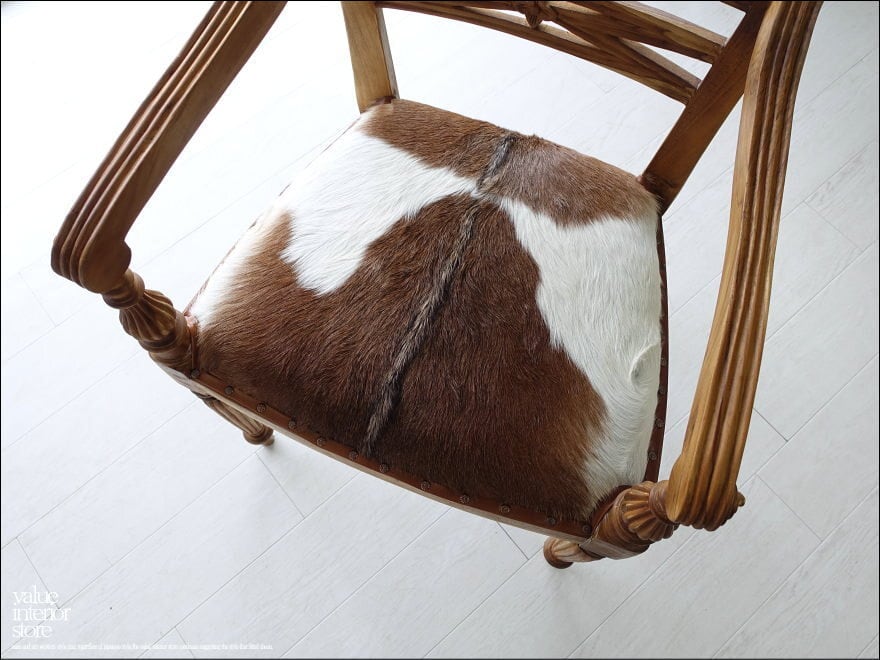 チークの味のある風合いが魅力のウッドフレームに、高級感のある毛皮付きレザーを座面を独特なスタッズで打ち、置いてあるだけでも存在感のあるチェア。