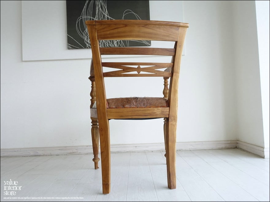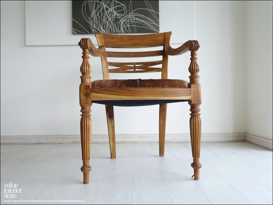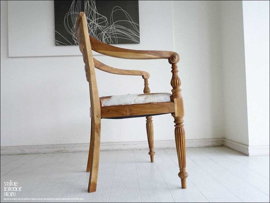 チークレザーアームチェアfurputi/11 ダイニングチェア 肘掛けイス 椅子 毛皮張り レザーチェア 本皮 シングルソファ 無垢材家具 ナチュラル