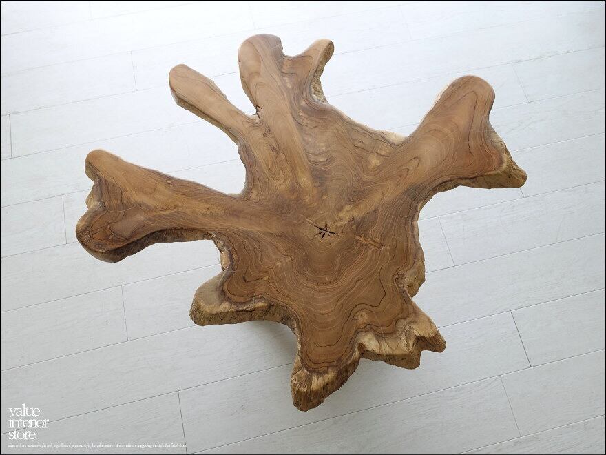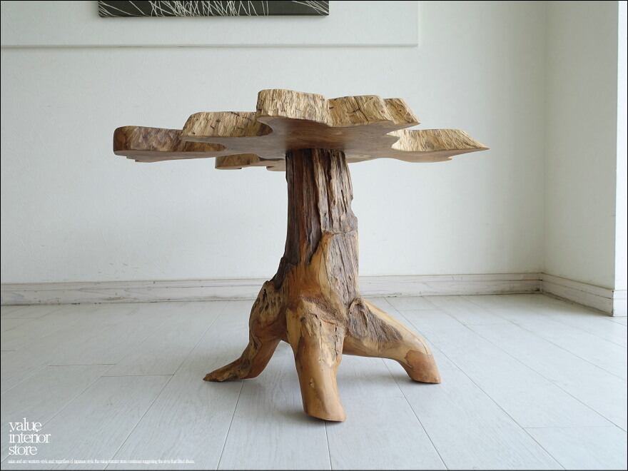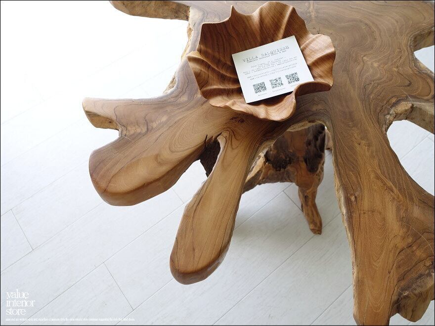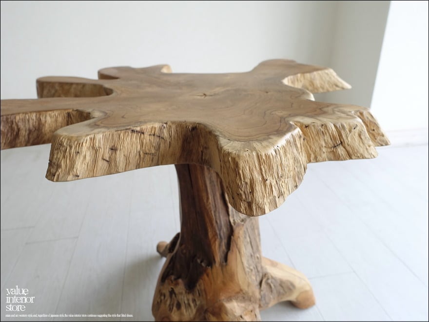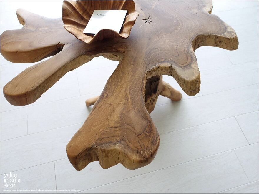 自然な様の一枚板を天板に使用したチーク無垢材のテーブル。素朴で癒される雰囲気があります。