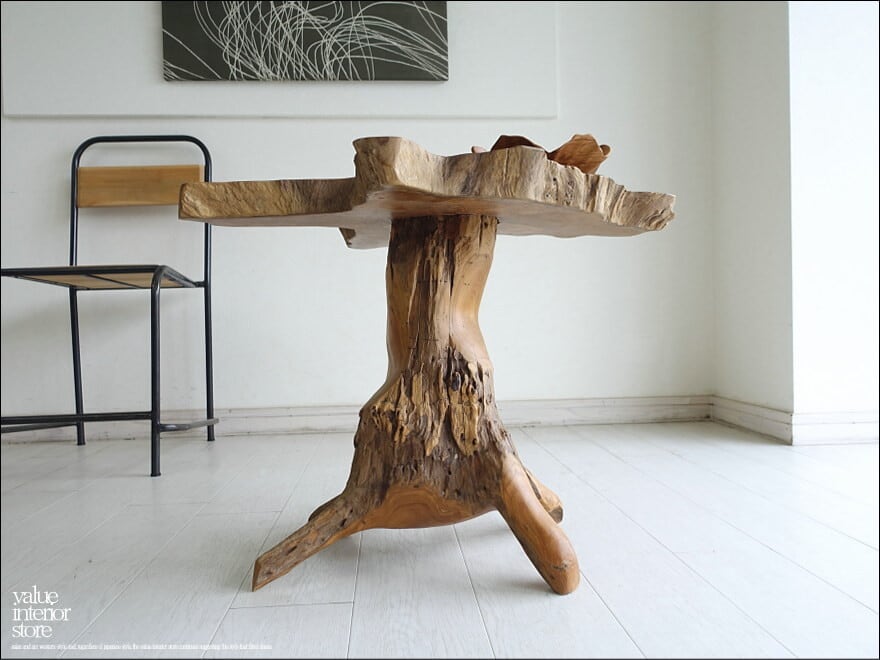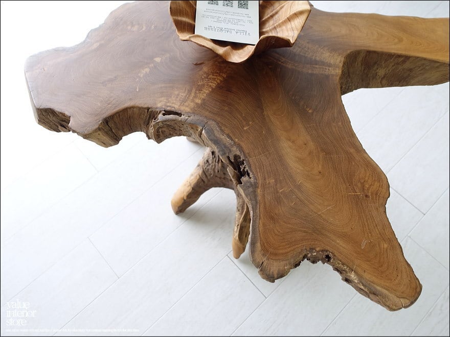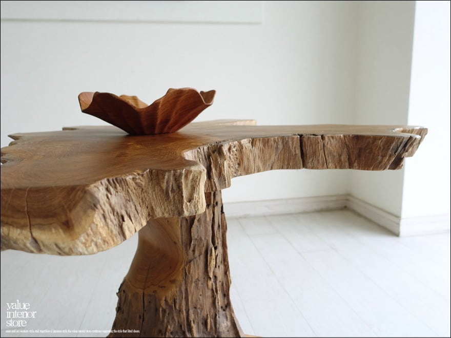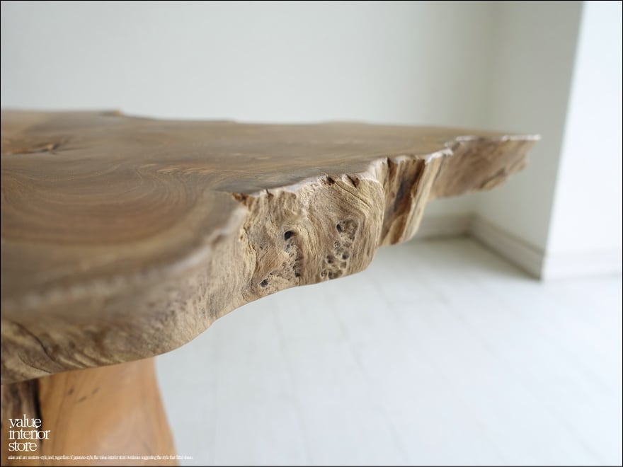 自然な様の一枚板を天板に使用したチーク無垢材のテーブル。素朴で癒される雰囲気があります。