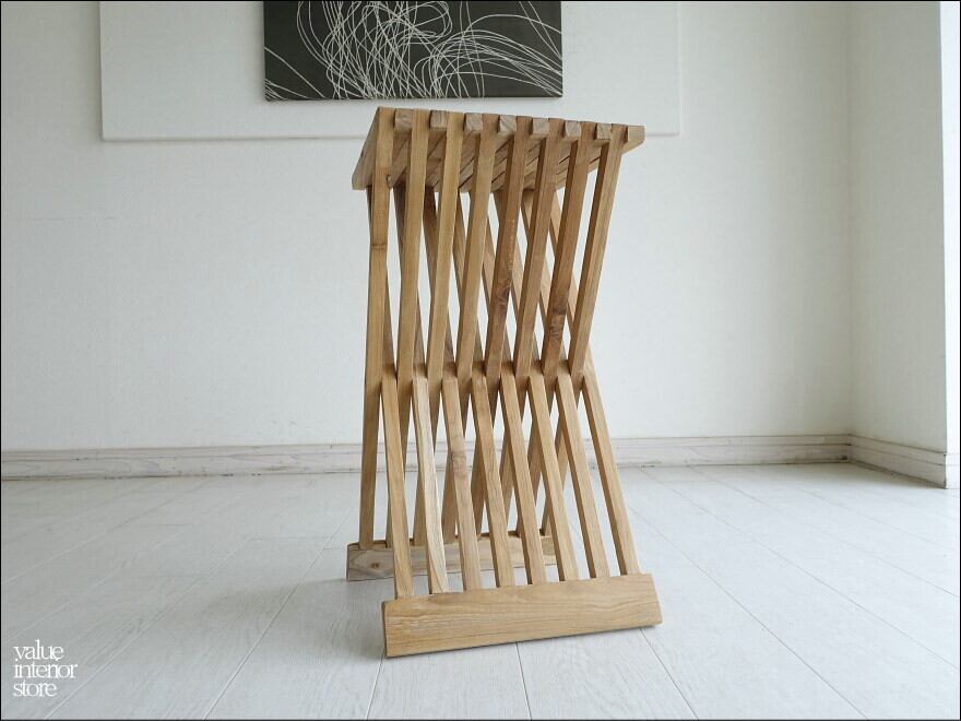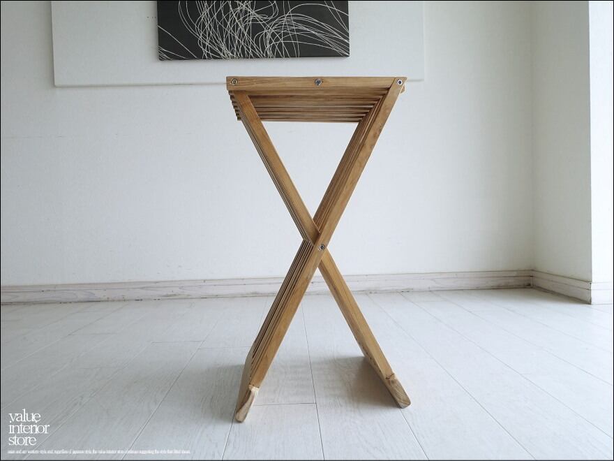 細めバーですがシッカリとした作りで、素朴な魅力が感じられます。椅子以外にもサイドテーブルやナイトテーブル、ちょっとした飾り台や花台としてもお使いいただけるデザインです。折り畳めばコンパクトに収納いただけますのでとても便利です。この機会にぜひどうぞ。