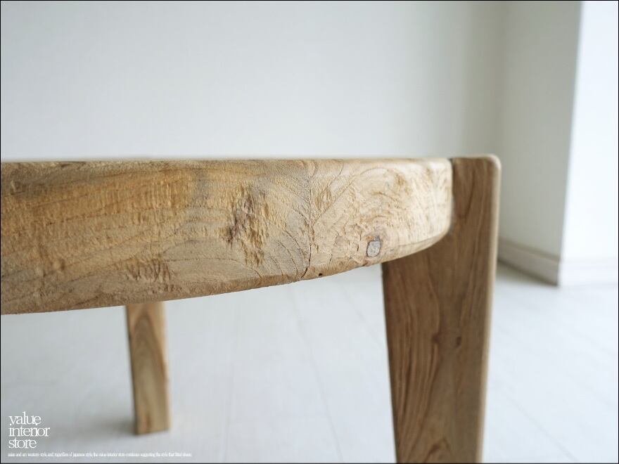 一目見ただけで素材が持つ素朴な質感に惹かれるオールドチーク無垢材のリビングテーブル。厚みのある天板を天板と同じ長さまで伸びた三つの脚がシッカリと支えていて安定感も抜群です。飾り気のないシンプルなデザインで、素材のそのものの良さをお楽しみいただけますので、おくつろぎをいただくリビングの雰囲気づくりにお役立ていただけます。また、高さがスツールの座面の高さとしても最適で、強度も十分ありますのでベンチとしてもお勧めです。