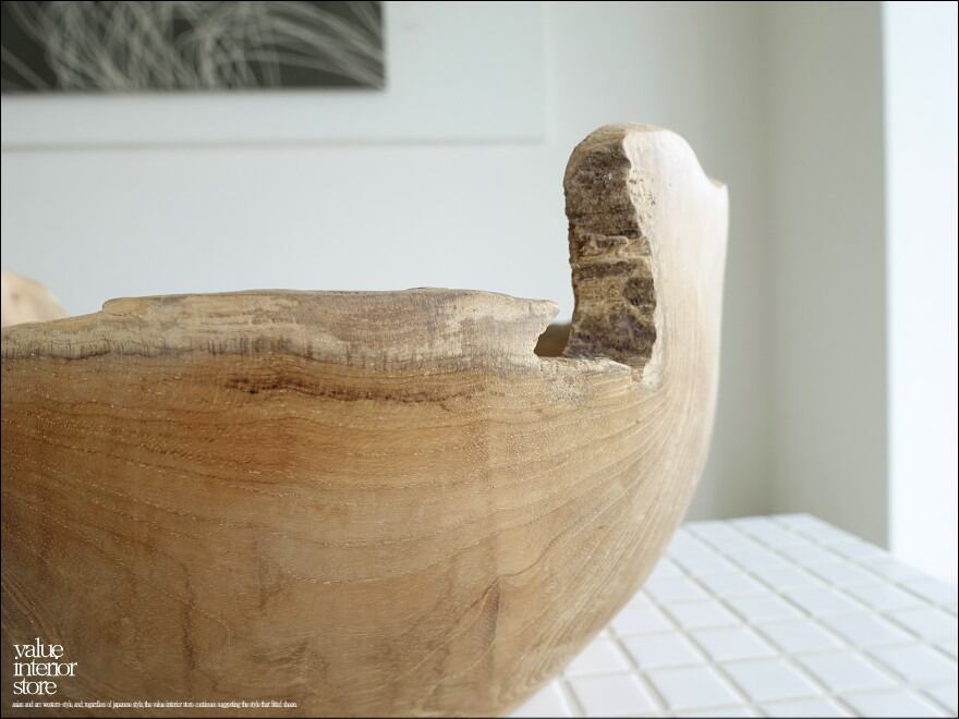 変化に富んだプリミティブで素朴な質感のチーク無垢材の大型のボウル。同じ形の無い味のある形は一点物の良さを感じさせてくれます。表面はミネラルオイル(ライム油・大豆油・チョウジ油・ナツメグ油)仕上げで、サラダボウルなどの食器としてもお使いいただけます。(食品等輸入届出書提出済)