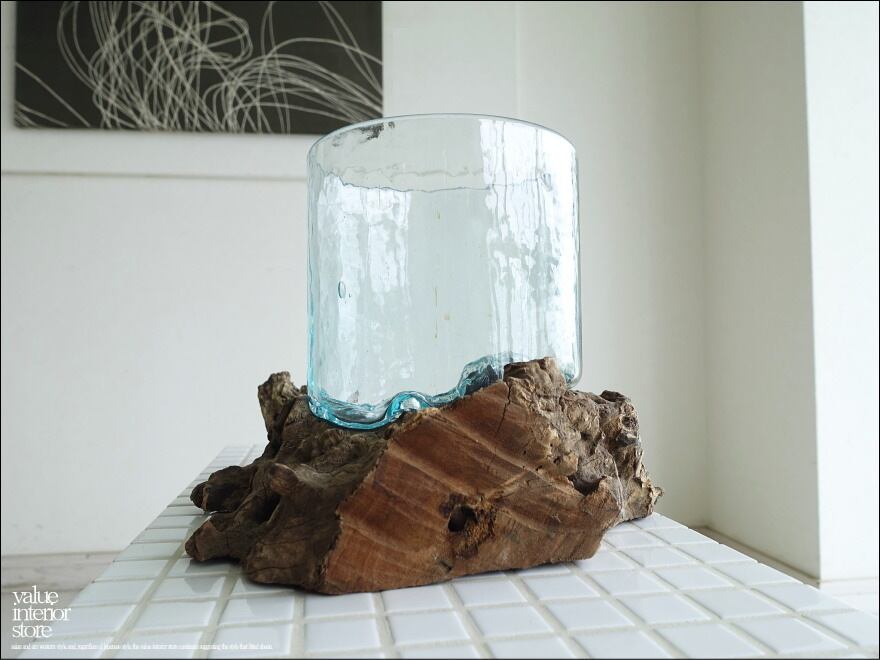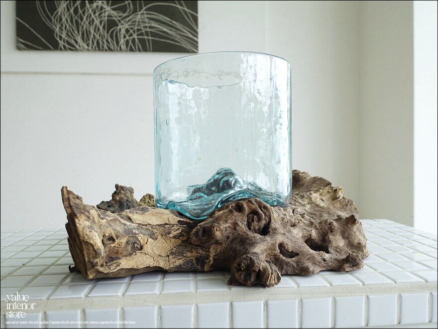 プリミティブな無垢材の土台に吹きガラスを合わせたフラワーベース。メダカ鉢にも良いサイズです。同じ形のものはなく、どちらの素材も大変個性的で味があります。