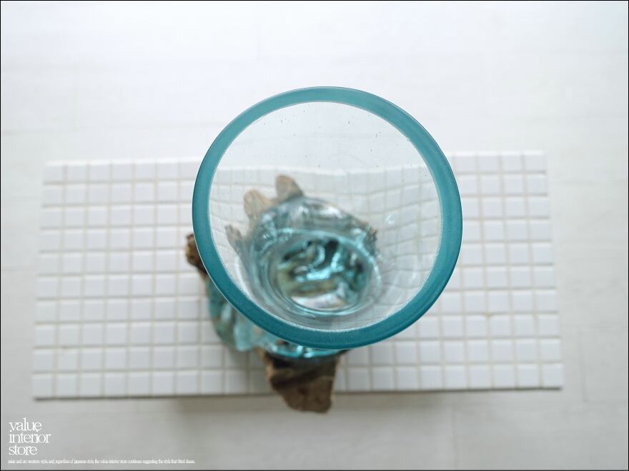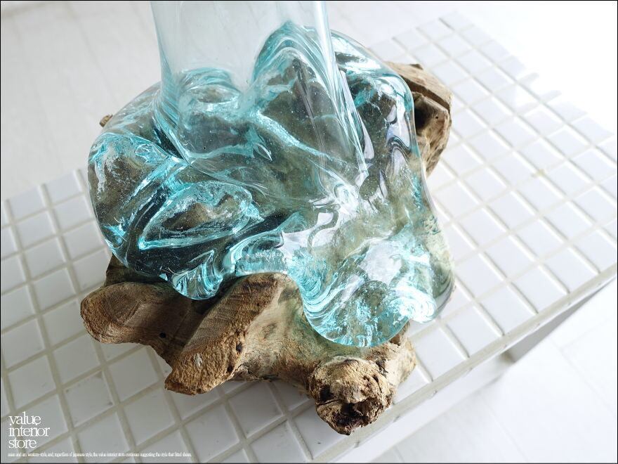 プリミティブな無垢材の土台に吹きガラスを合わせたフラワーベース。一点一点手作りで同じ形のものはなく、どちらの素材も大変個性的で味があります。主役のお花を自然に引き立たせてくれます。
