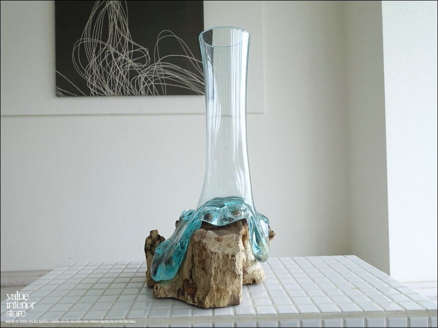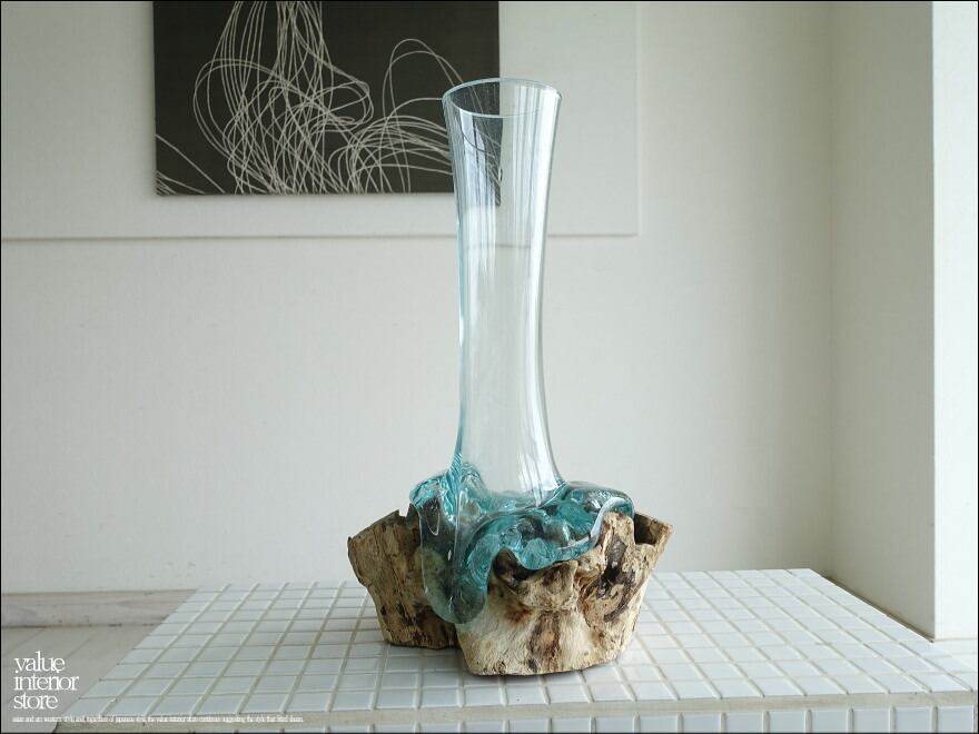 硝子フラワーベースTall40cm 花瓶 プリミティブガラスベース 手作り 一輪挿し 一点物 ハンドメイド 無垢材 自然な様