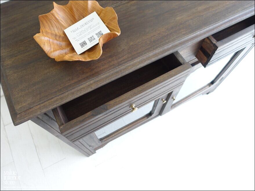 食器棚やリビングの飾り棚として幅広くお使いいただけます。引出しも2箇所あるので物によって上手に収納できます。真鍮金具はシンプルなものを合わせましたので見た目もスマートな印象。天板部分はフラットなのでお気に入りの小物などをディスプレイしてお楽しみください。