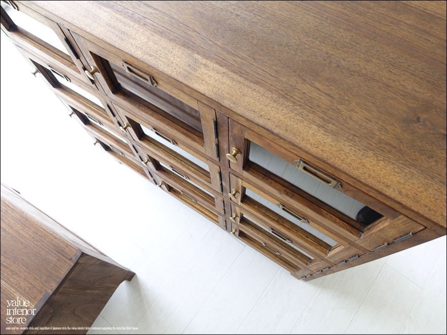 また、木目の際立つミディアムブラウン塗装で、油分を多く含むチーク材の色味に一層深みが増していくところも楽しみの一つです。ハンドルにはネームホルダー付きの真鍮金具を使用しましたので、中身が表示できて収納にとても便利です。お気に入りスペースにぜひお使い下さい。