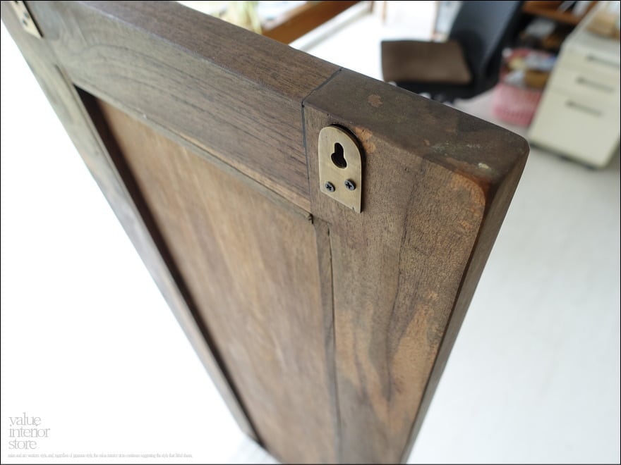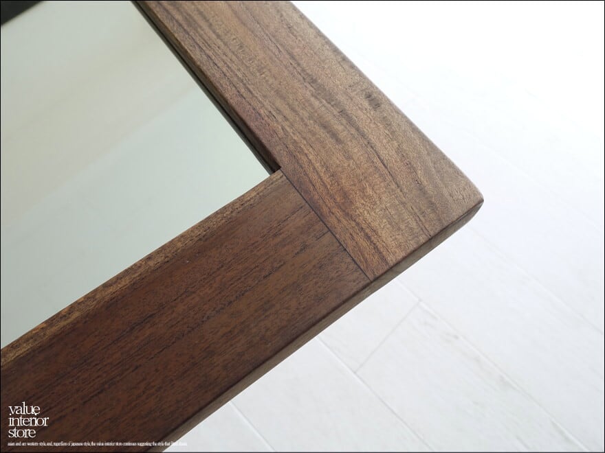 チークの木目が伝わっているミディアムブラウンのフレームミラー。シンプルでどんなテイストにも馴染みやすいデザインですので、空間を暖か味のある雰囲気に演出します。フレーム裏面縦方向に2箇所壁掛け用の穴がありますので壁にビスを設置して頂き引っ掛けるか、安全な場所に立掛けてご使用下さい。