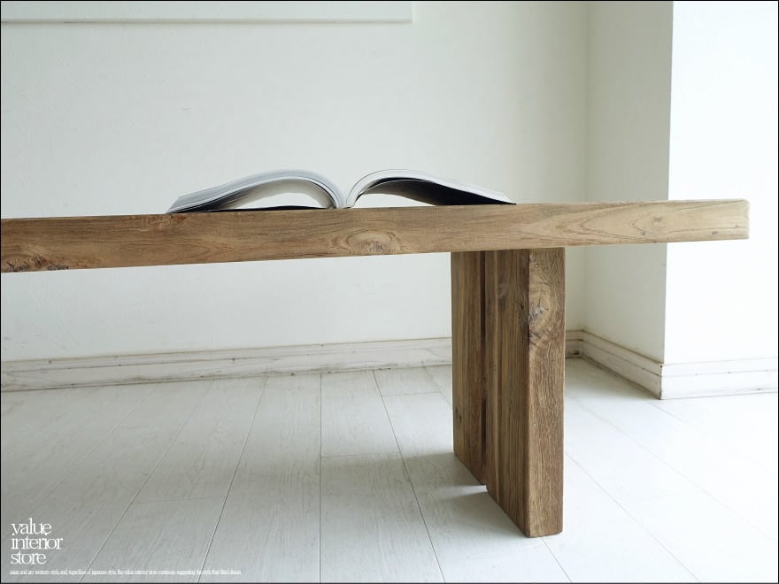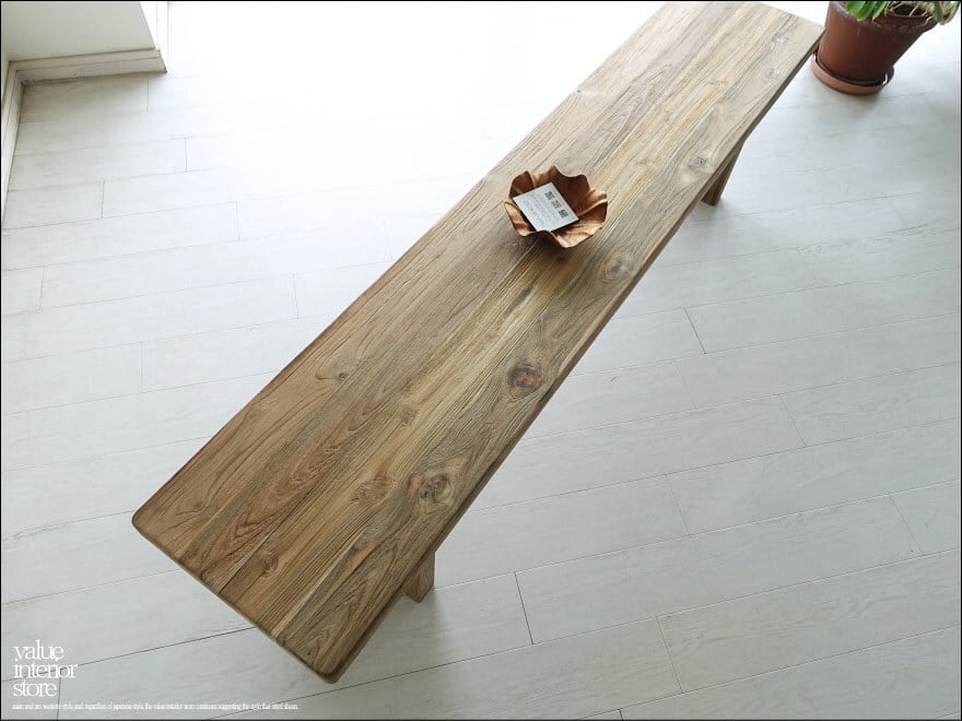 オールドチークならではの味と雰囲気を持つ横幅200cmのロングベンチ。座面は5cmもの厚みがあり、素材ならではの張りと硬さを感じていただけて、オールドチーク表面の荒々しさと変化に富んだ木肌が全体的に見られます。ゆったりとしたお部屋の雰囲気づくりにぜひお役立てください。