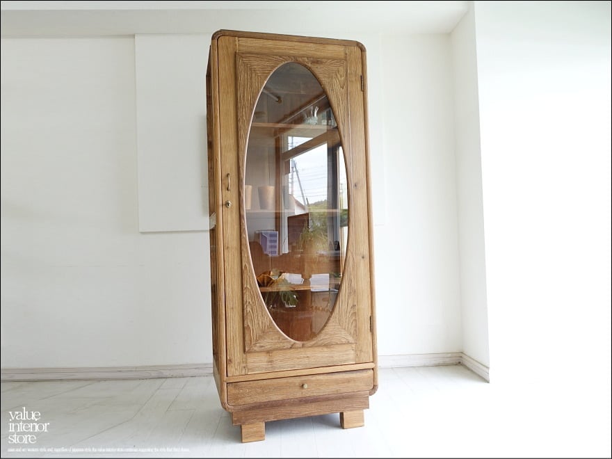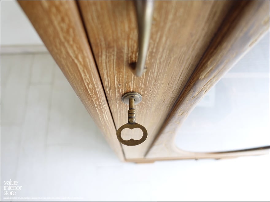 存在感のある大きさで奥行きもたっぷりあるのでキッチンの食器棚としてもリビングの収納棚としても便利にお使いいただけます。扉はガラスなのでディスプレイするような感覚で中に入れるものにもこだわりたくなります。扉は真鍮鍵付き。鍵がとても可愛らしく、きちんと機能しています。全体的に素朴で落ち着いた色合いでシックな雰囲気を残した表面処理(ワイヤーブラシで表面を削るラスティック仕上げ)になっています。カフェやショップなどの什器として食器棚、本棚、収納棚などにもおすすめです。