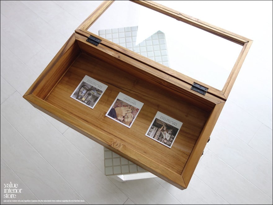 ナチュラルなチーク総無垢材の卓上用のガラスショーケース。