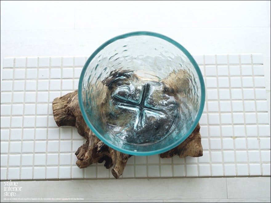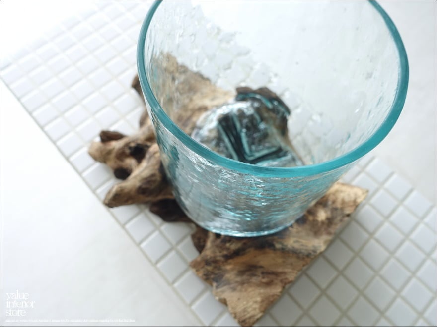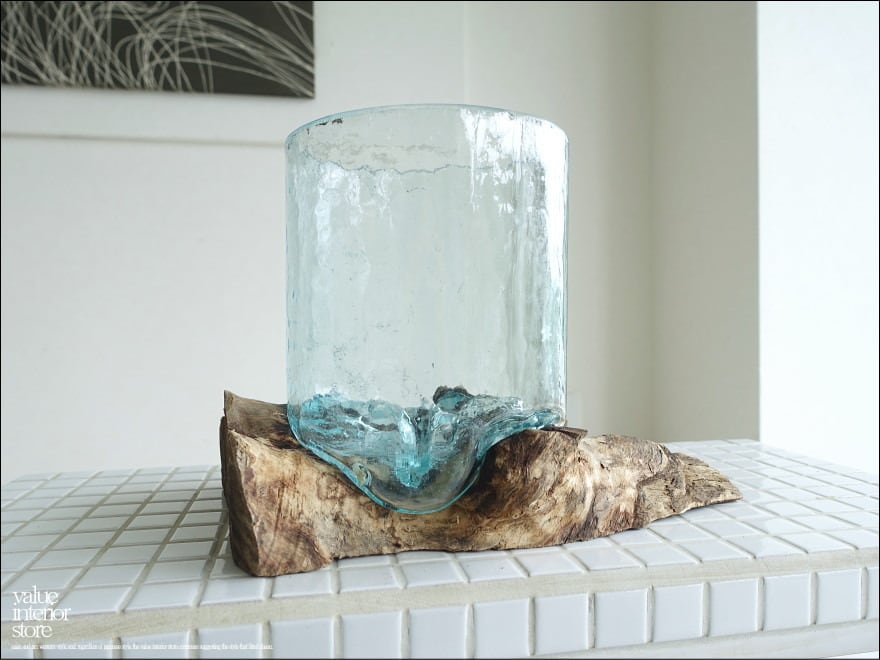 プリミティブな無垢材の土台に吹きガラスを合わせたフラワーベース。メダカ鉢にも良いサイズです。同じ形のものはなく、どちらの素材も大変個性的で味があります。