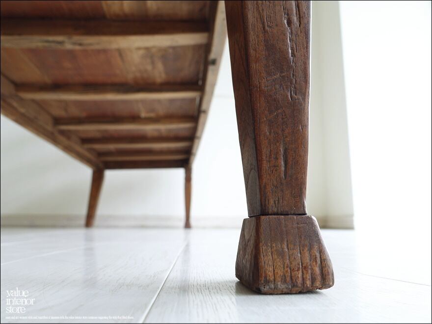 座面を支えるフレーム部分は厚みのあるものを使用していますので重厚感もあり、素材独特の色合いや傷などから古いものならではのゆっくりと刻み込まれた歴史すら感じさせてくれるようです。