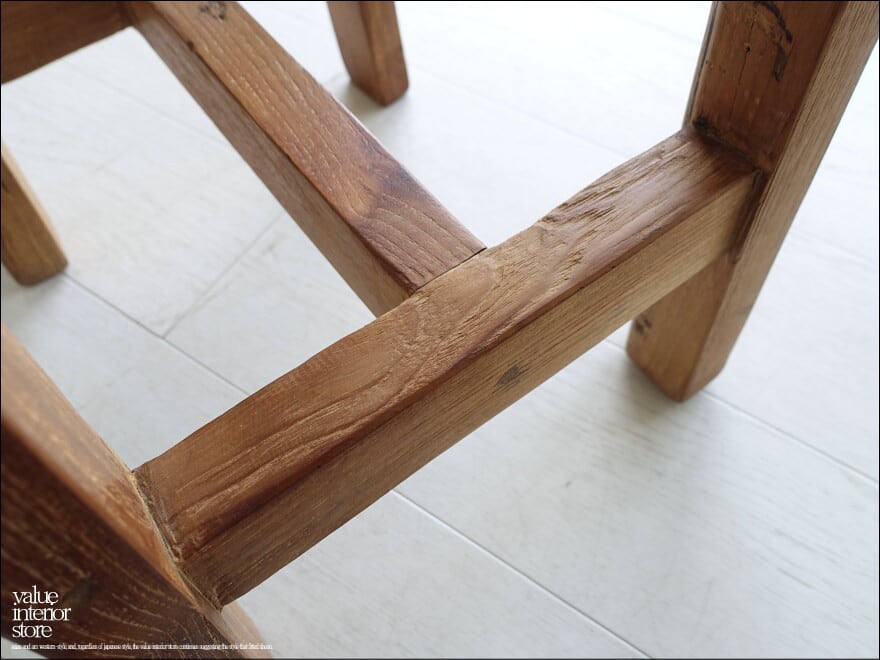 オールドチークならではの渋く落ち着いた雰囲気を持つ角型スツール。座面にはチーク材の個性的な木肌が現れています。角型の脚をさらにH字にそれぞれの脚をつなぐフレームを取り付けていますので、とてもしっかりとした頑丈な作りです。表面はワイヤーブラシで削り取ることで無垢材の素朴な質感を一層引き立たせています。