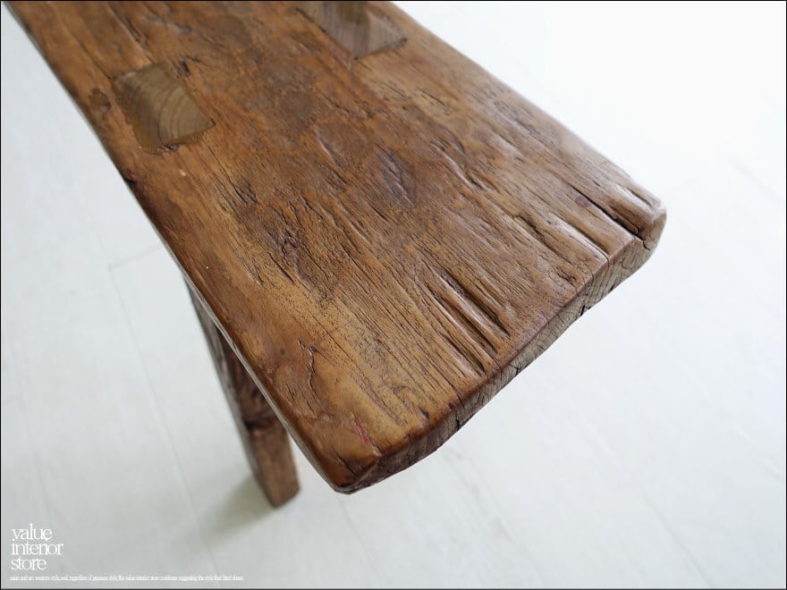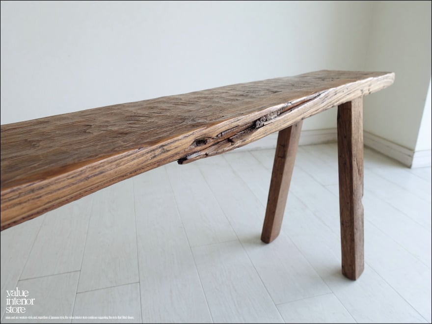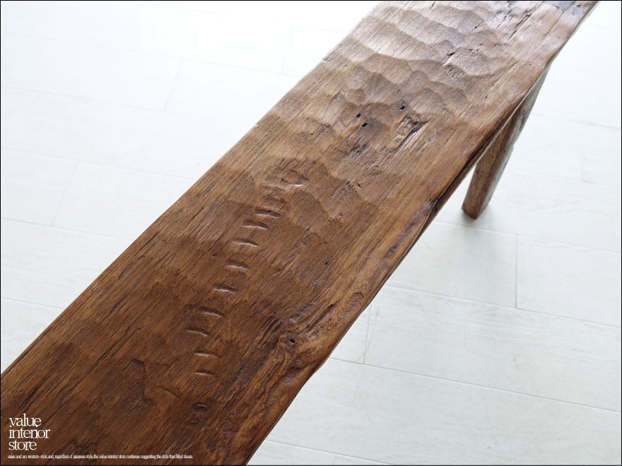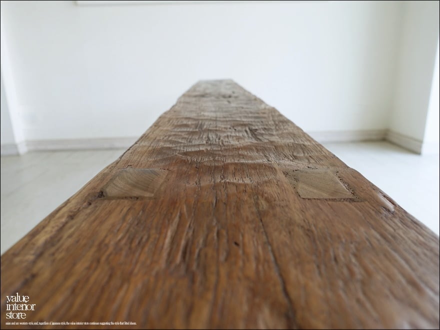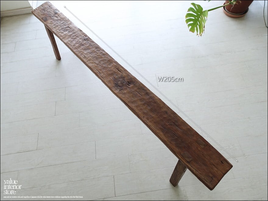 オールドチークならではの味と雰囲気を持つ横幅205cmのロングベンチ。ちょうなハツリの削り方で表面を荒く削った方を座面に使用して、全体を飴色のある光沢に表面を仕上げました。一味板の座面は素材ならではの張りと硬さを感じていただけて、オールドチーク表面の荒々しさと変化に富んだ木肌が全体的に見られます。ゆったりとしたお部屋の雰囲気づくりにぜひお役立てください。