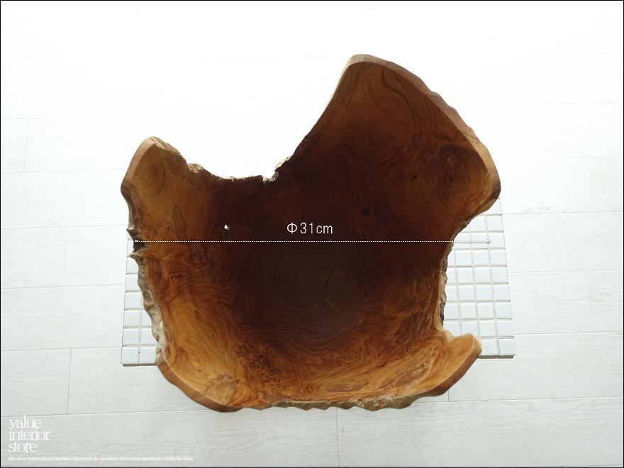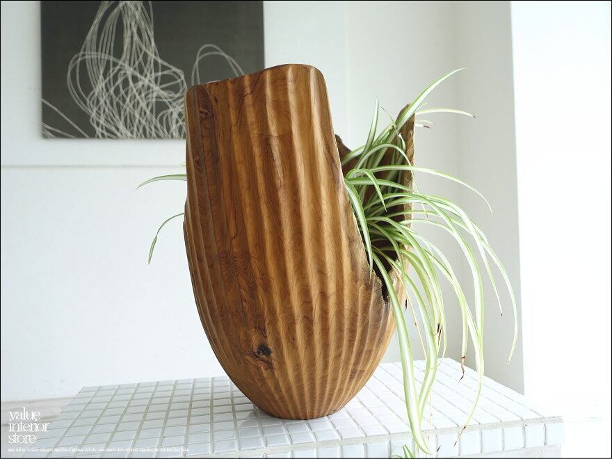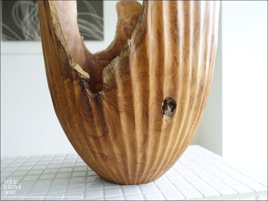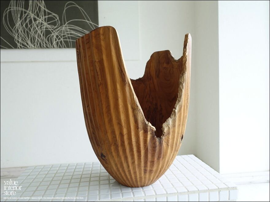 一本の丸太より削り出して製作する、自然な様の形と柔らかで変化に富んだ木肌が印象的なチーク総無垢材のプランツカバー。縦に入ったラインが底に近づくにつれてキュッと引き締まったデザインになっていて目を引きます。ここまで薄く製作ができますのも、張りを持つチーク材で乾燥状態に優れている素材だからこそのものです。