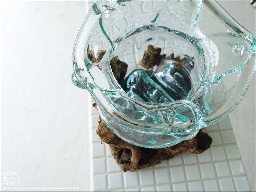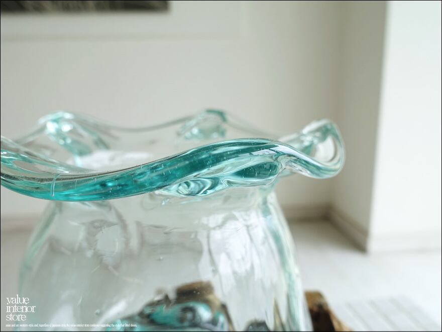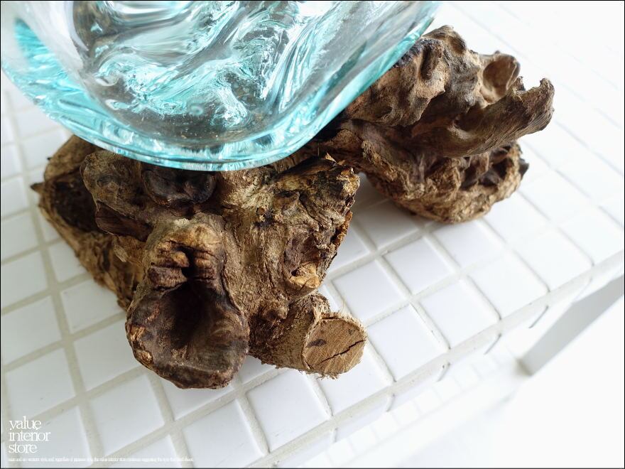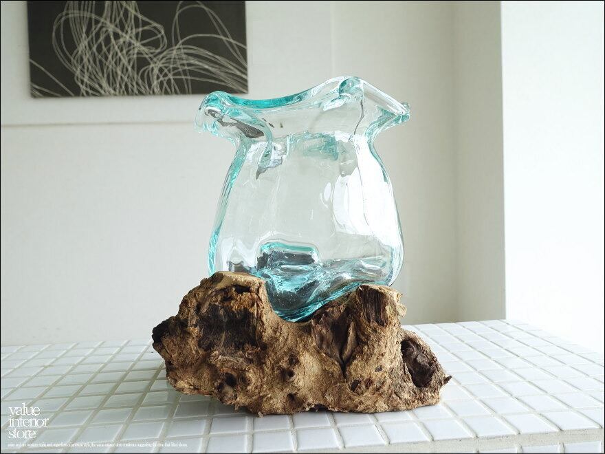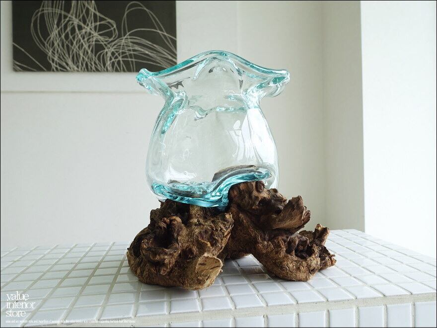 プリミティブな無垢材の土台に吹きガラスを合わせたフラワーベース。メダカ鉢にも良いサイズです。同じ形のものはなく、どちらの素材も大変個性的で味があります。
