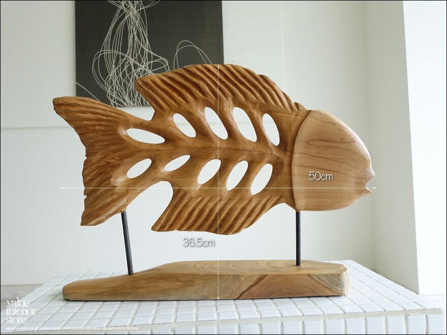 チーク無垢材 置物/魚 装飾 魚の形のオブジェ カフェ装飾 飾り フィッシュ デコレーション fish 無垢材アート 什器 置き物 W50xH36.5cm