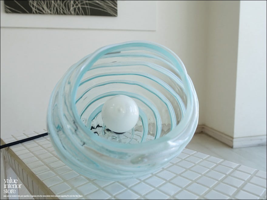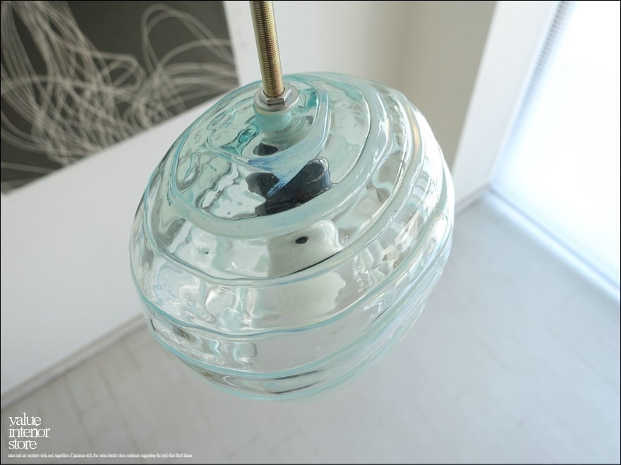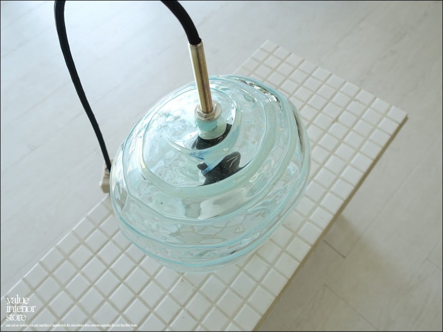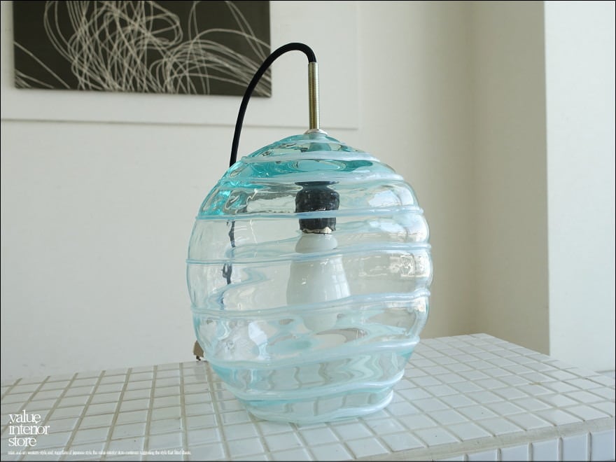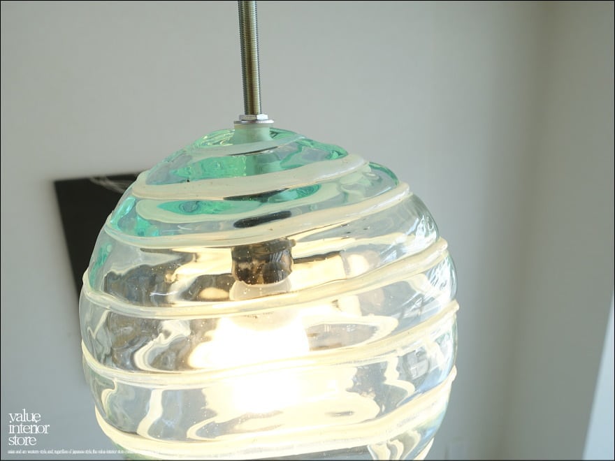 厚みのある吹きガラスのランプシェード。しま状に少し白色のガラスが下に行くにつれてハッキリとしたラインで入っていて、電球の明るさと合わせて、空間を柔らかな雰囲気に包み込んでくれます。天井電源コネクターは、一般家庭用の引っ掛けシーリングタイプ(安全ストッパー付き)。・コードは長さ調節不可。電源は壁スイッチ操作。