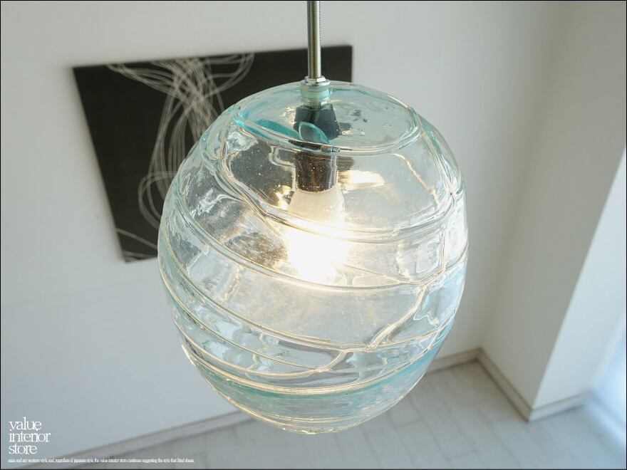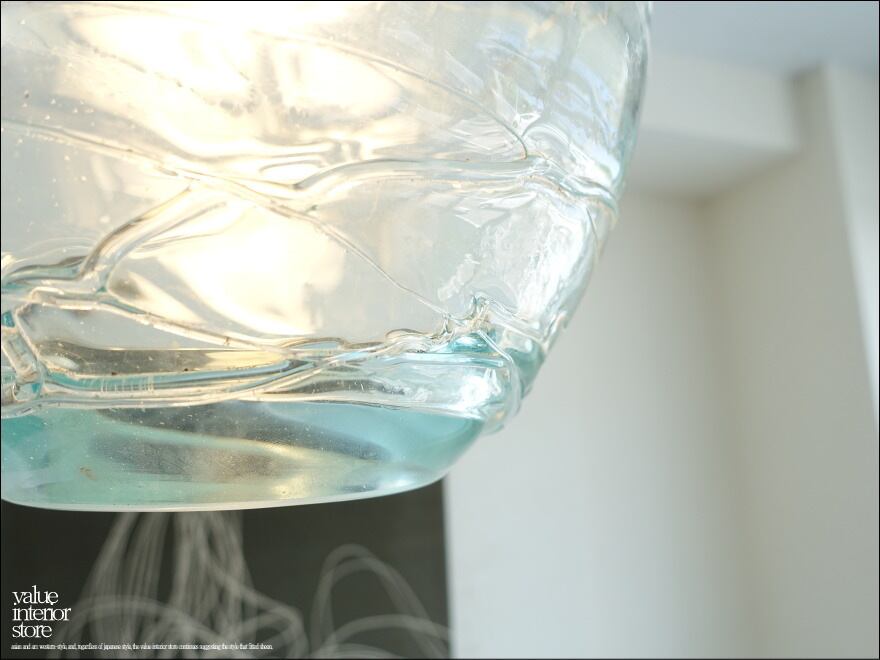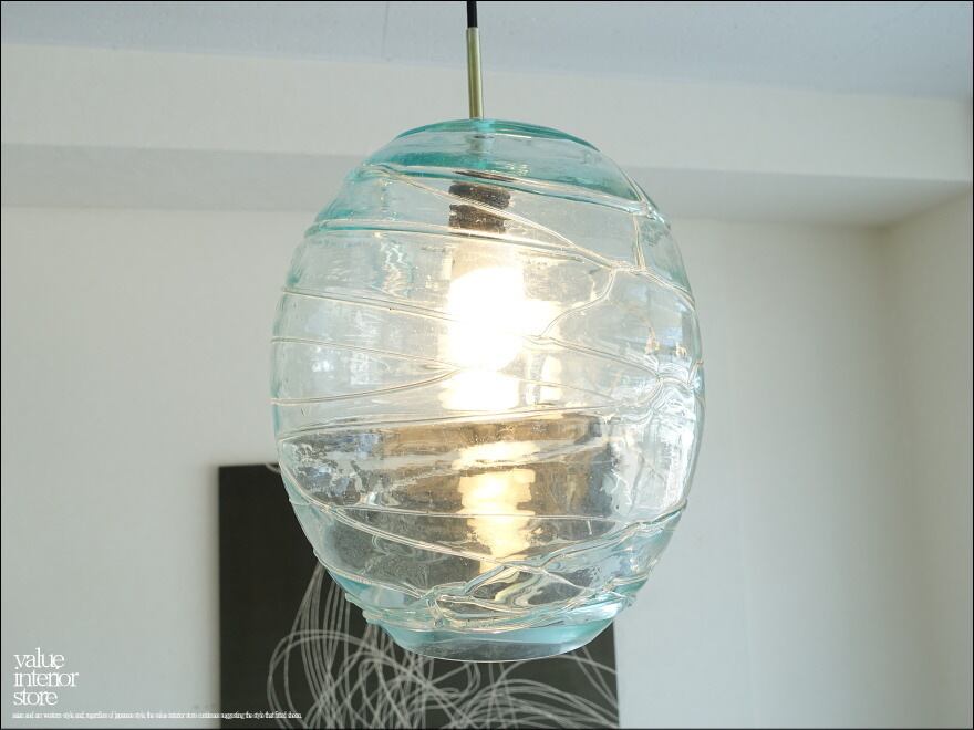 厚みのある吹きガラスのランプシェード。しま状にクリアガラスの模様が幻想的で、電球を通して空間を柔らかな雰囲気に包み込んでくれます。天井電源コネクターは、一般家庭用の引っ掛けシーリングタイプ(安全ストッパー付き)。・コードは長さ調節不可。電源は壁スイッチ操作。