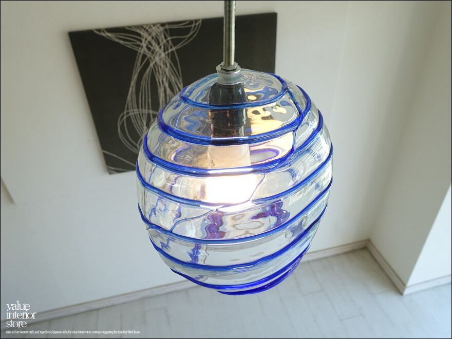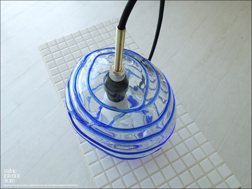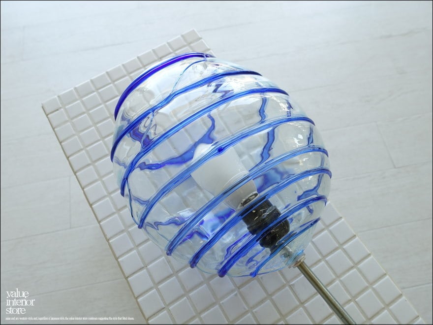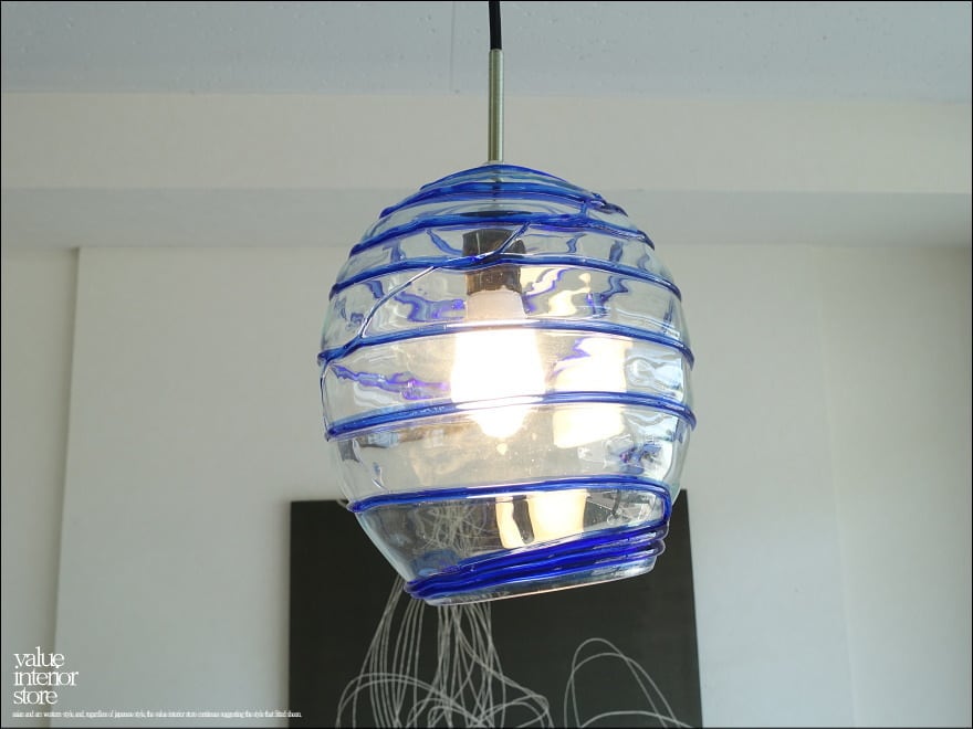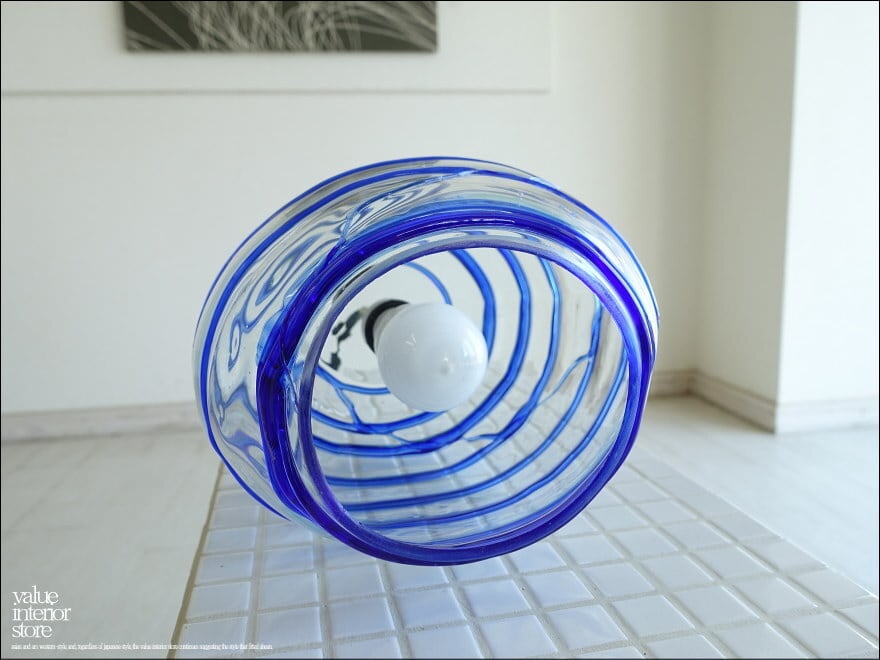 厚みのある吹きガラスのランプシェード。螺旋状に入ったクリアガラスに青いガラスのラインの模様が幻想的で、電球を通して空間を柔らかな雰囲気に包み込んでくれます。天井電源コネクターは、一般家庭用の引っ掛けシーリングタイプ(安全ストッパー付き)。・コードは長さ調節不可。電源は壁スイッチ操作。