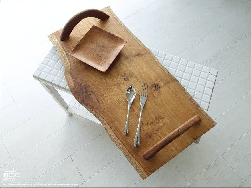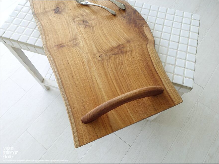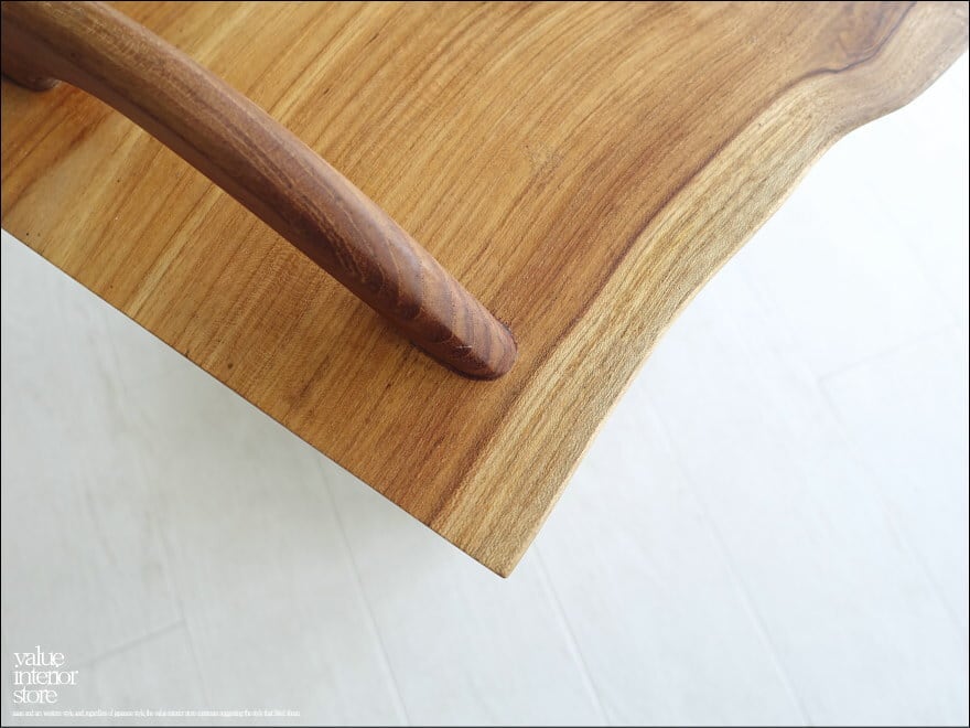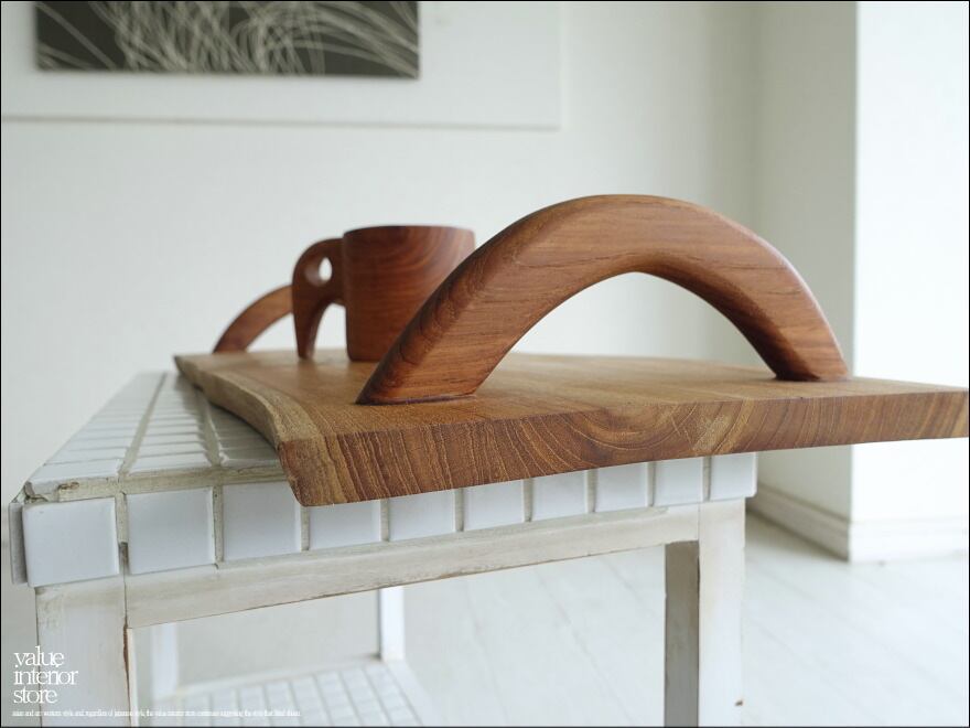 ナチュラルなチーク材の変化に富んだ形と木肌が素敵なサービングトレイ。個性的で自然な形を活かし魅力的に仕上がっています。ハンドメイドなられはの滑らかな仕上がりは職人の技術の高さが感じられます。表面はミネラルオイルで(ライム油・大豆油・チョウジ油・ナツメグ油)で仕上げています。柔らかな質感が魅力で手になじみます。