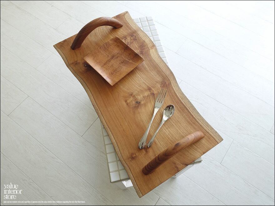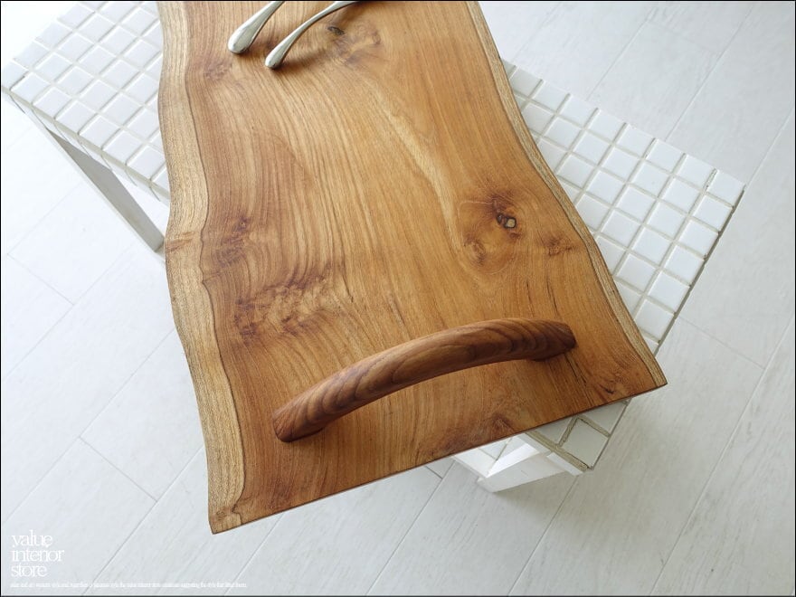 ナチュラルなチーク材の変化に富んだ形と木肌が素敵なサービングトレイ。個性的で自然な形を活かし魅力的に仕上がっています。ハンドメイドなられはの滑らかな仕上がりは職人の技術の高さが感じられます。表面はミネラルオイルで(ライム油・大豆油・チョウジ油・ナツメグ油)で仕上げています。柔らかな質感が魅力で手になじみます。