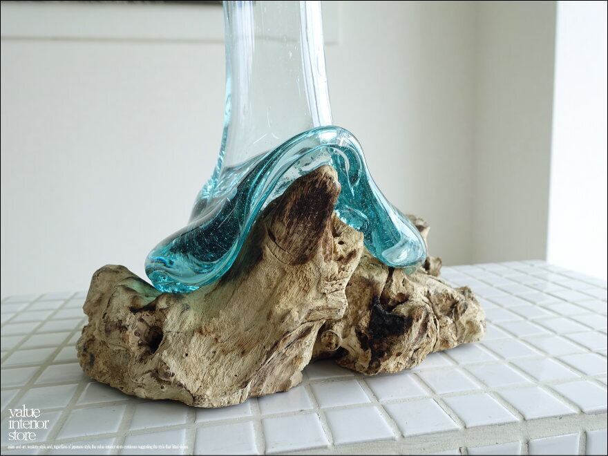 プリミティブな無垢材の土台に吹きガラスを合わせたフラワーベース。一点一点手作りで同じ形のものはなく、どちらの素材も大変個性的で味があります。主役のお花を自然に引き立たせてくれます。