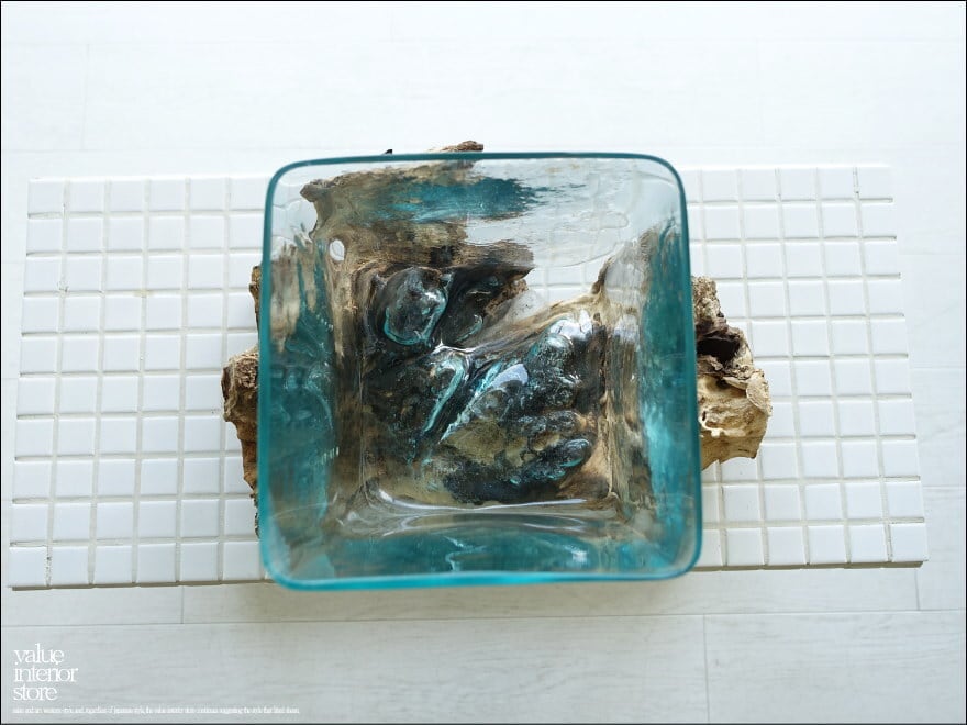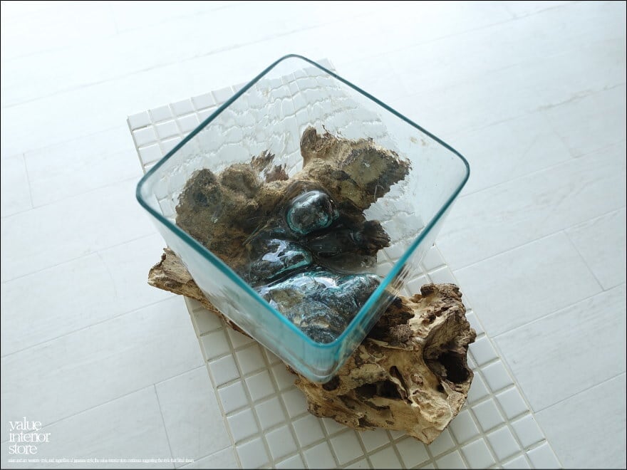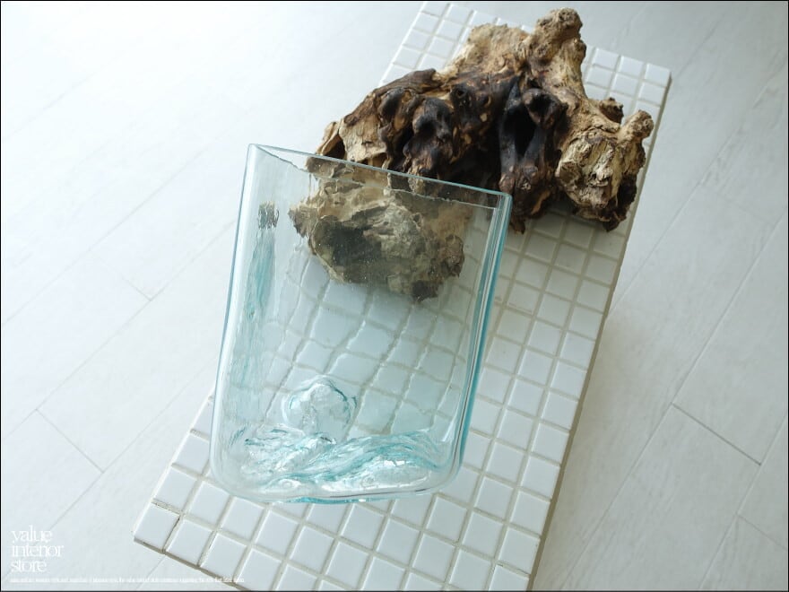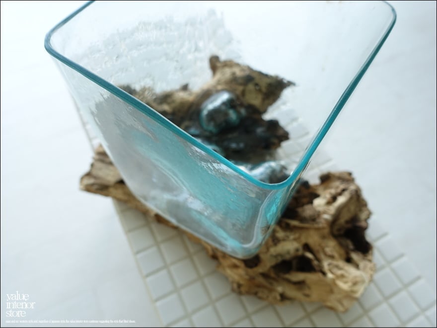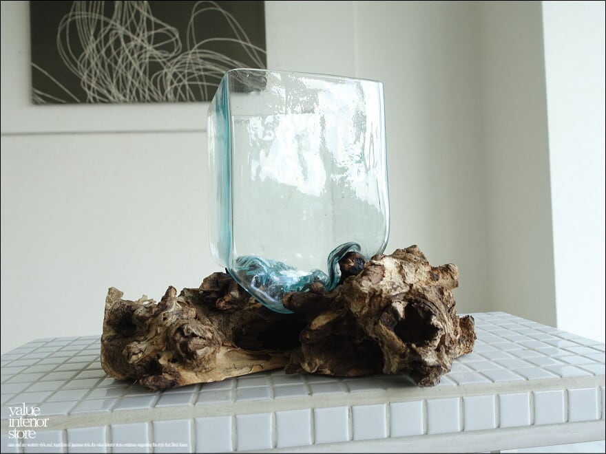 プリミティブな無垢材の土台に吹きガラスを合わせたフラワーベース。メダカ鉢にも良いサイズです。同じ形のものはなく、どちらの素材も大変個性的で味があります。
