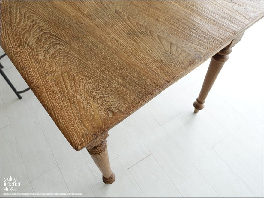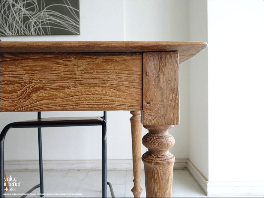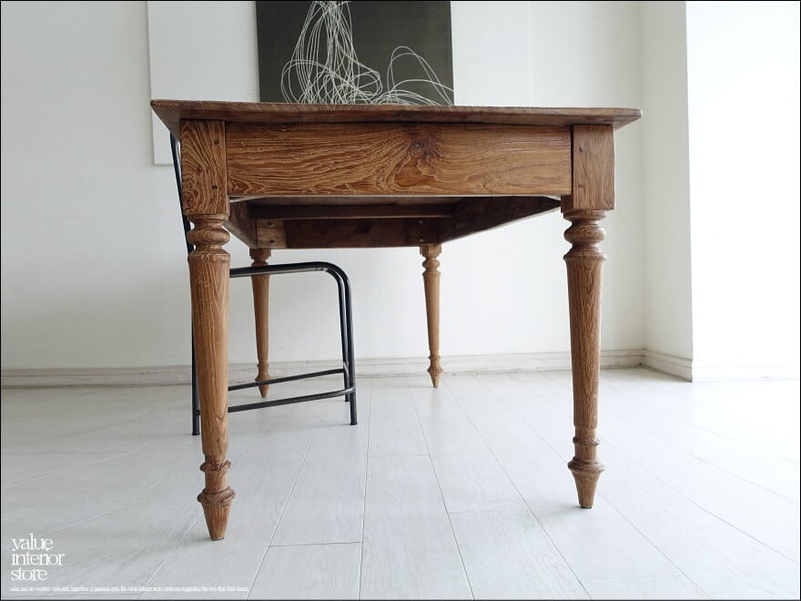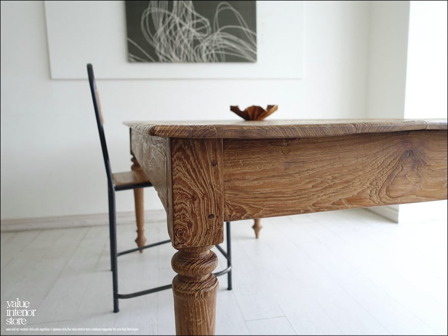 細身でバランスの取れた遊び心に溢れる脚のデザインが特徴的で、古いチーク材ならでは余裕を感じさせる落ち着きには刻み込まれた歴史すら感じられるようです。飲食店のアクセントテーブルとして、お店の展示テーブルなどスローダウンした雰囲気づくりにもぜひお役立てください。