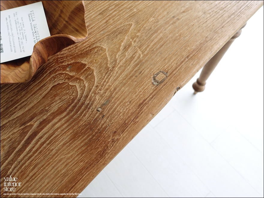 こちらの商品は、表面再仕上げや欠損箇所の補修などをしている再生家具となります。元々の雰囲気は残して仕上げています。傷、ワレやフシ穴、ワレの修理痕、色の濃淡、傾き、歪み、反り、汚れなどがございますが、素材や古いものの持つテイストとしてご理解をいただきますようお願い致します。