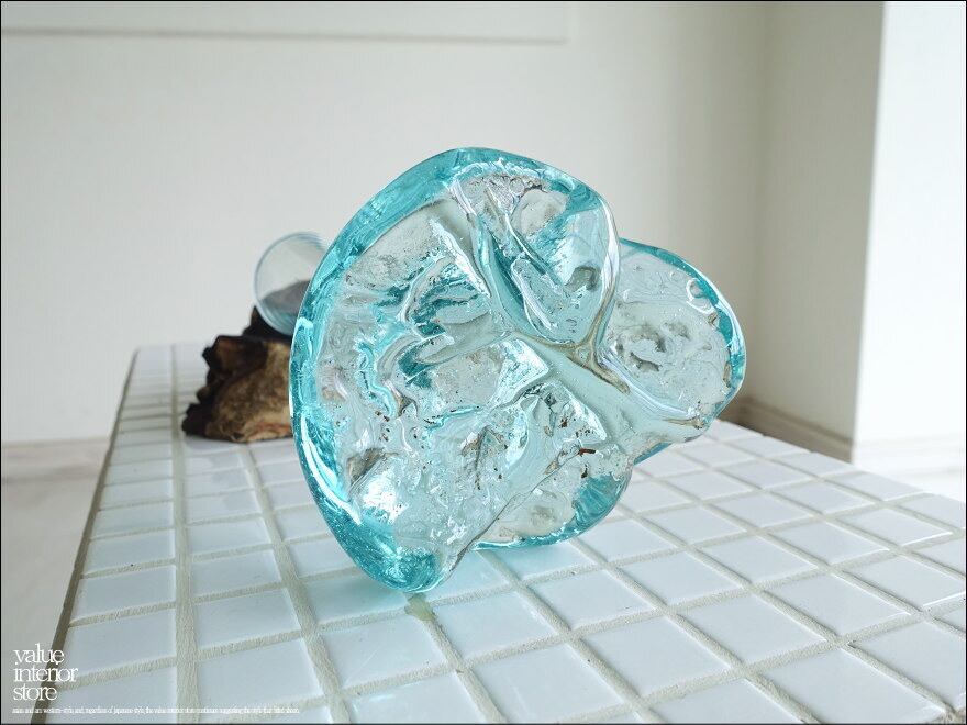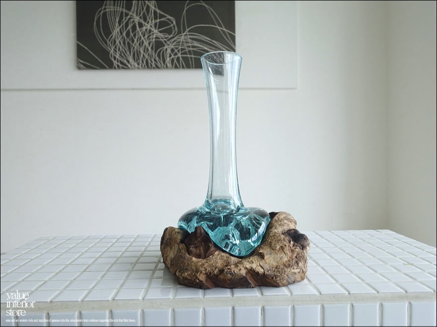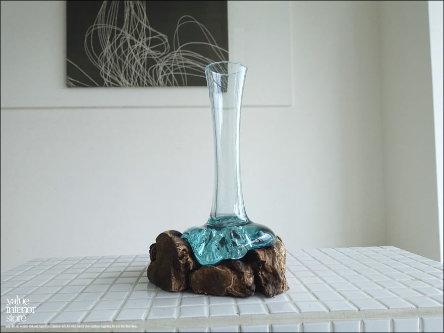 プリミティブな無垢材の土台に吹きガラスを合わせたフラワーベース。一点一点手作りで同じ形のものはなく、どちらの素材も大変個性的で味があります。主役のお花を自然に引き立たせてくれます。